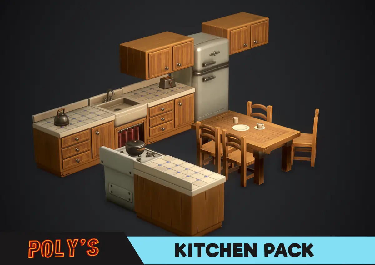 This is a stylized kitchen pack which includes the following models: Fridge, Stove, Sink, Kettle, Toaster, Plates, Cups and plates, Cupboards, Table, Chairs, Saucepan, Floor Texture (Tileable)