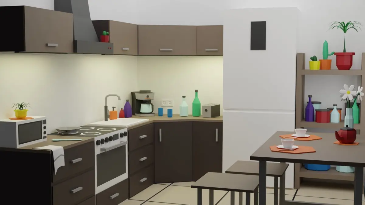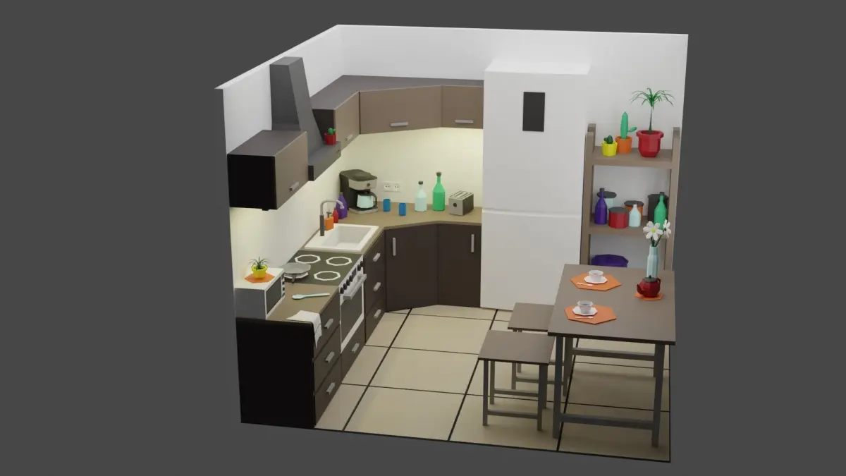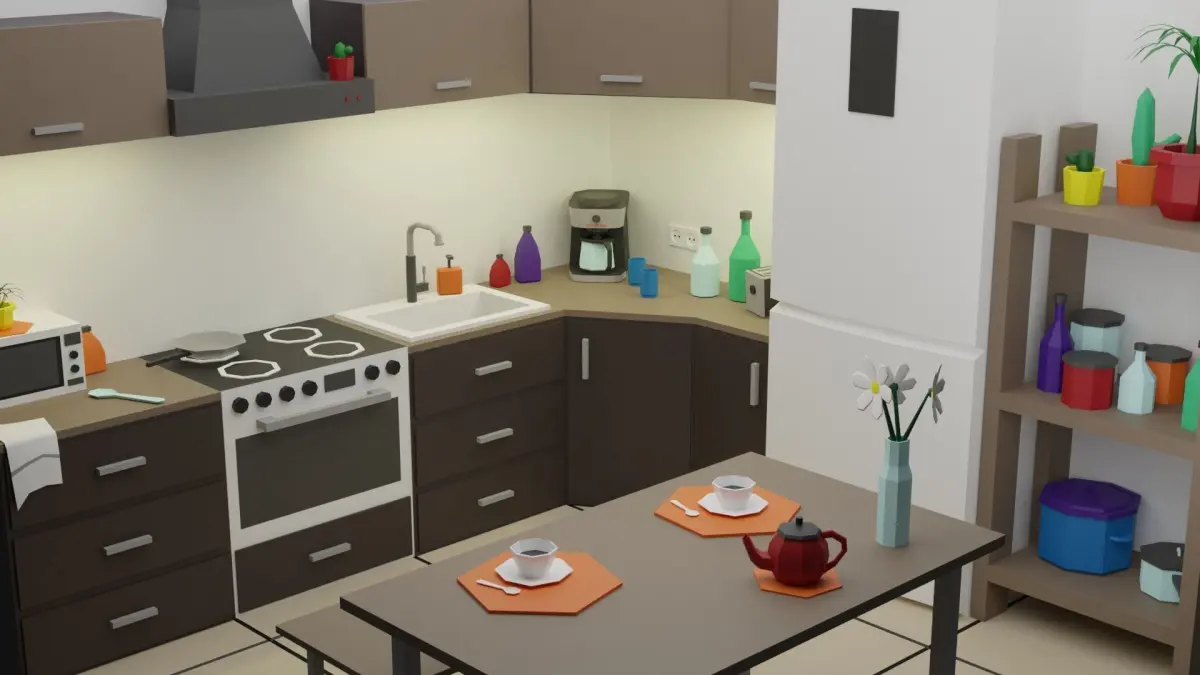 This set includes 40 unique props: kitchen cabinets / hood / refrigerator / electric stove / rack / table / chairs / microwaveoven / coffee machine / toaster / teapot / flowers / plants and accessories and much more!