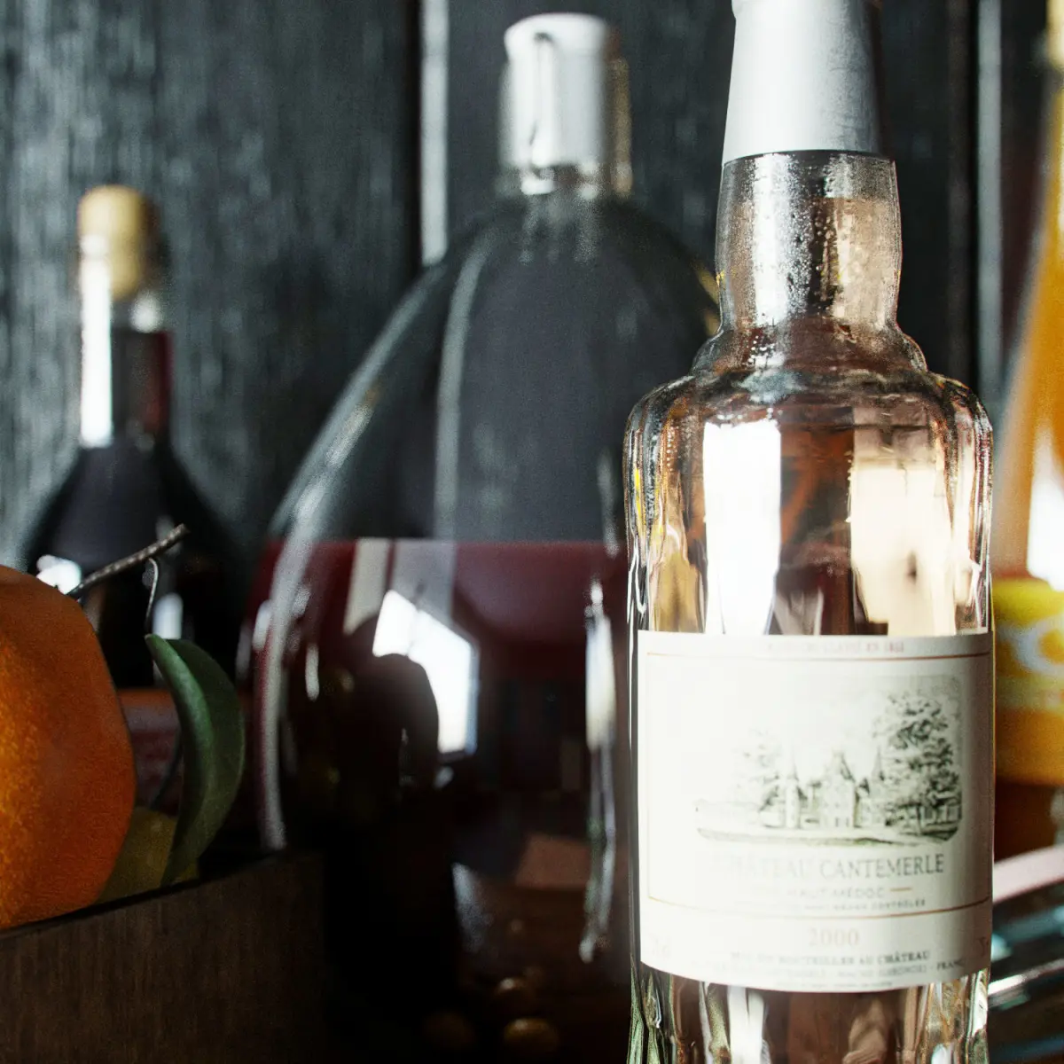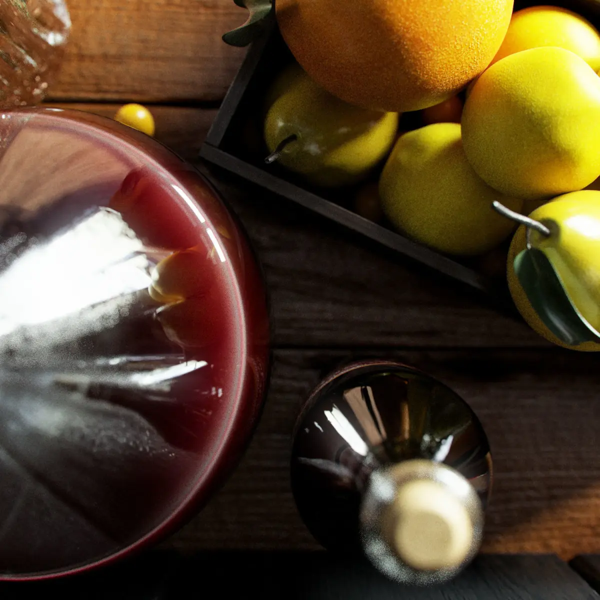 - bottles- wine- fruit- oranges- pears- cherry plums- cinnamon- cherries- orange juice- wooden box- decorative drawers