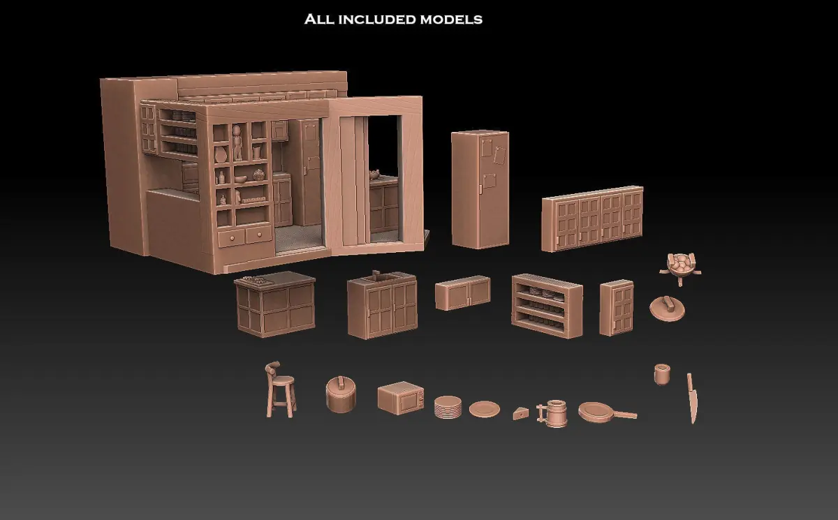 This model pack contains models originally part of a larger model kit based on the apartment from the sit-com Frasier. I've taken all the models included in the kitchen section of that apartment, and released as this separate product. These models are generally low-poly, and mainly intended for use as thematic decoration in tabletop games in the 28 to 54mm scale range. The models have all been prescaled to roughly 28mm scale, but you have to check their size in your slicer software and ajdust size according to you personal needs.