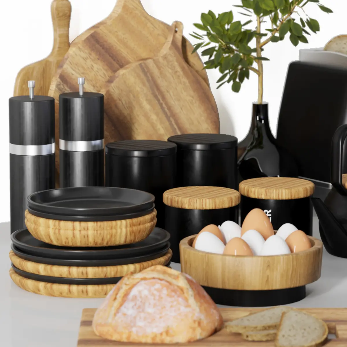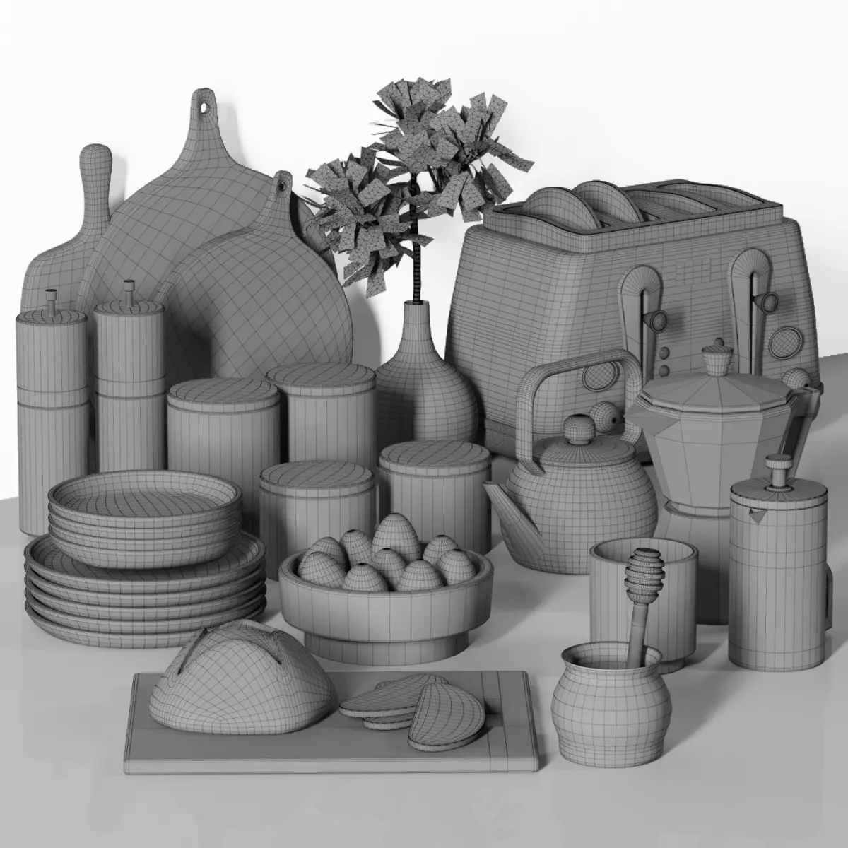 polys: 99594verts: 93599collection of kitchen objects include dishes, toaster, vase, grinder, bread, ... for kitchen decoration.