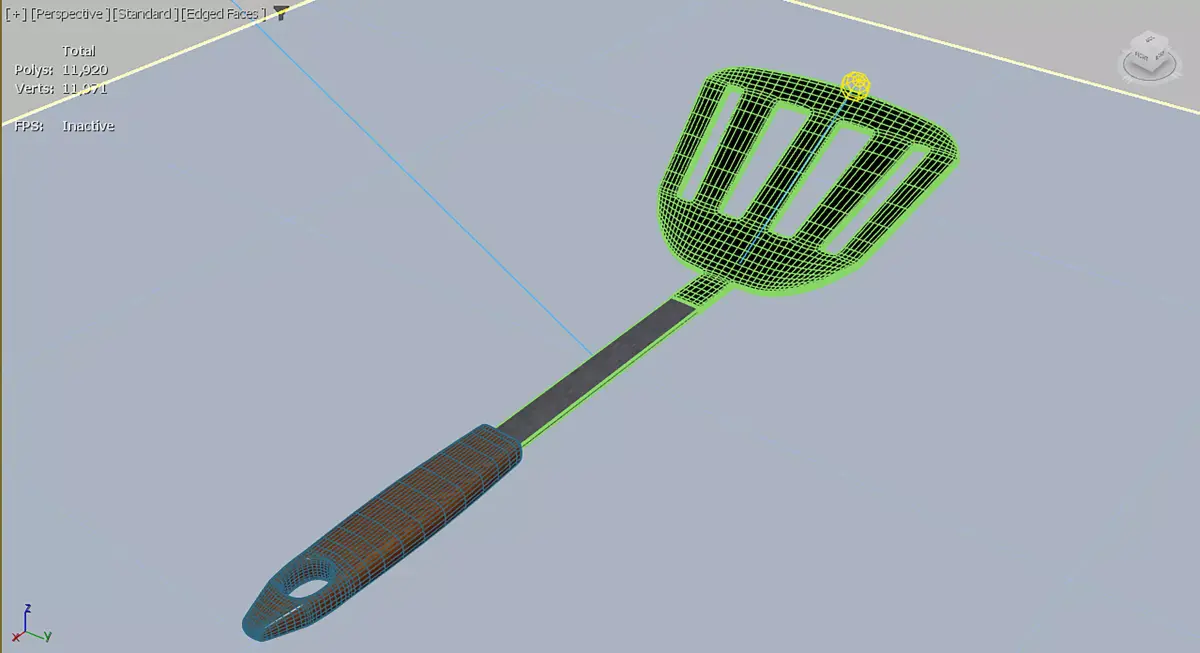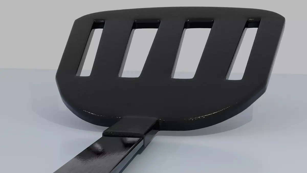 3DS Max 2026 kitchen spatula. This realistic 3D model depicts a kitchen spatula featuring a sleek design with a black metal slotted head, a sturdy metallic shaft, and a smooth wooden handle. The model highlights subtle surface reflections and material textures that enhance realism, including the glossy finish on the handle and the matte metal look of the spatula head. The lighting setup produces soft reflections across the surface, emphasizing the clean and modern aesthetic of the utensil. Perfect for use in kitchen visualization projects, product design showcases, or 3D animation scenes.