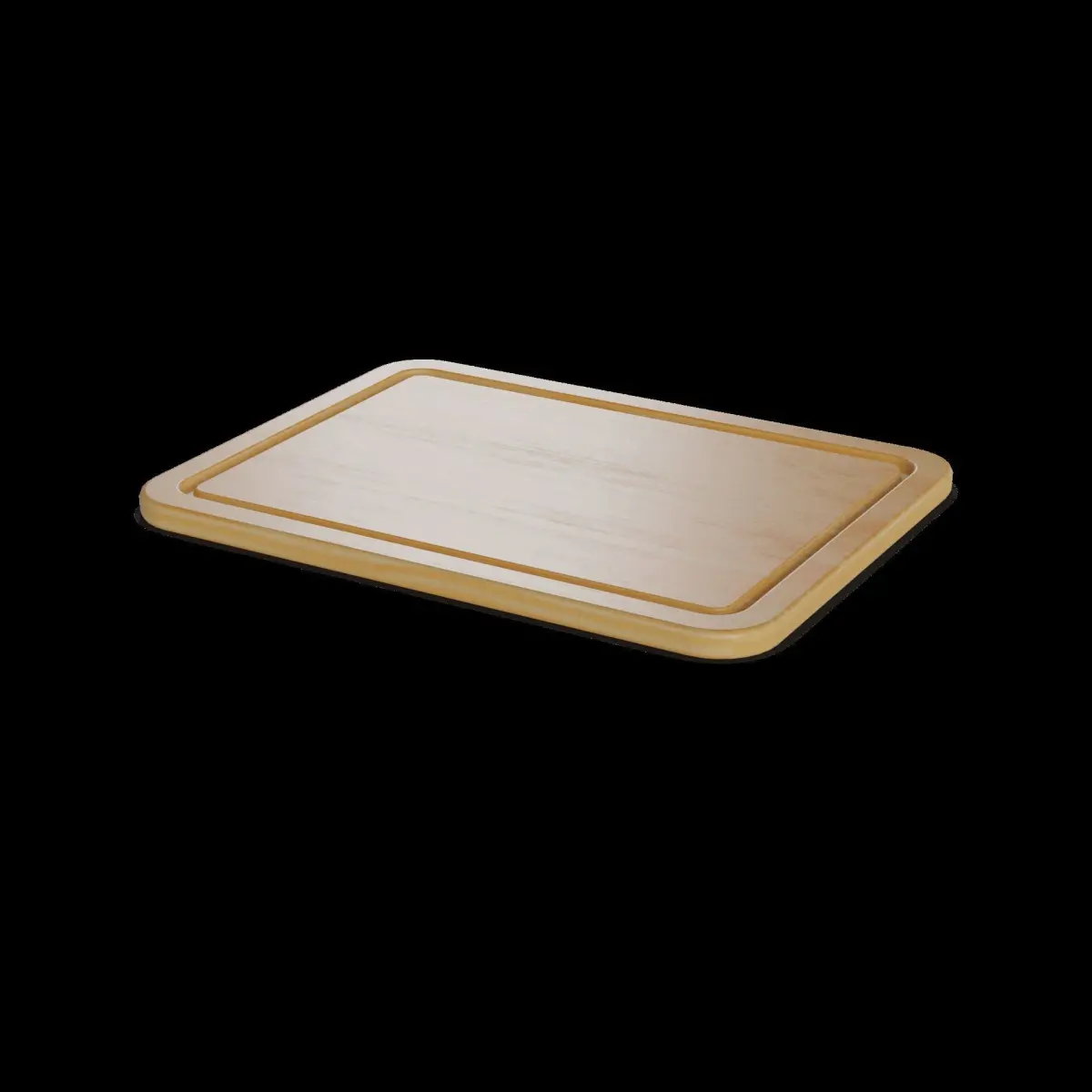 Cutting Board: A durable cutting board made from bamboo. The board has a natural wood grain pattern and is resistant to knife marks. It is packaged in a cardboard sleeve with a clear window, allowing customers to see the cutting board. The sleeve features a label with the text Cutting Board and a graphic representation of the board.
