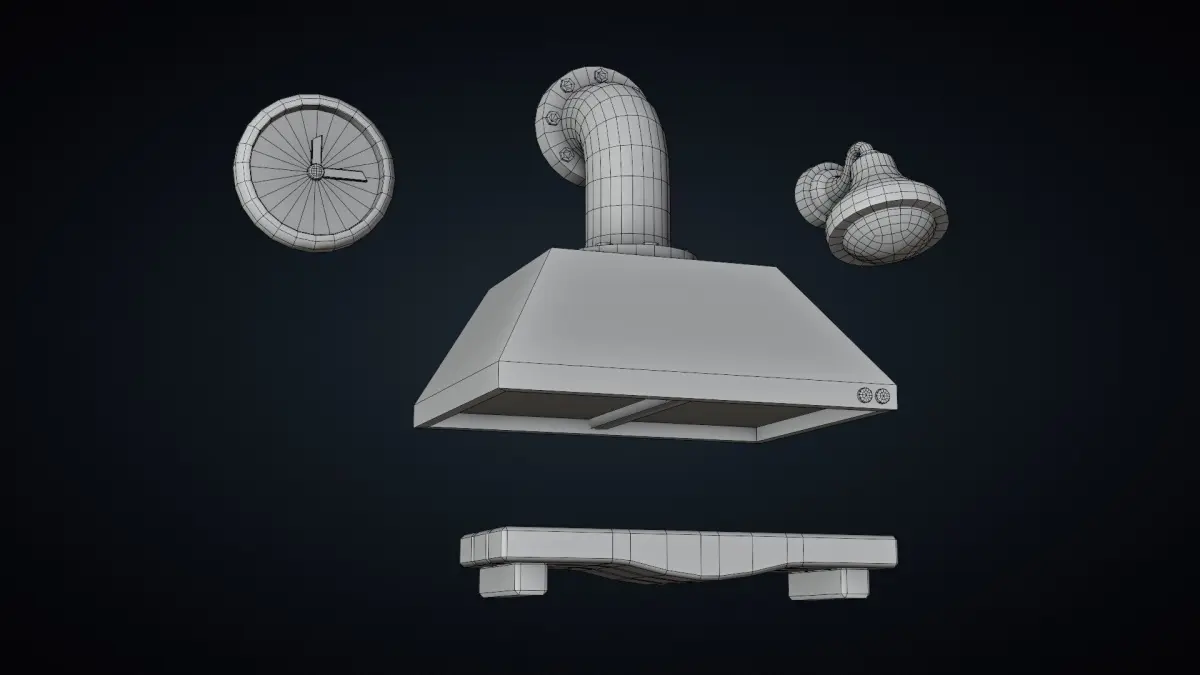 This is the part 10 of my Stylized Kitchen Pack, featuring a kitchen extractor, wall clock, lamp wall mounted and wall mounted shelf
