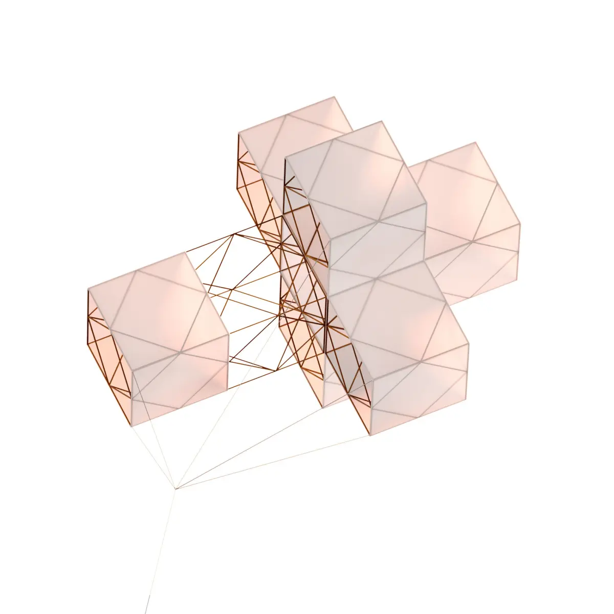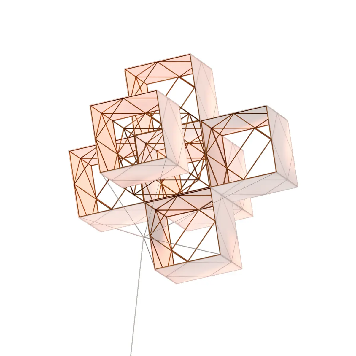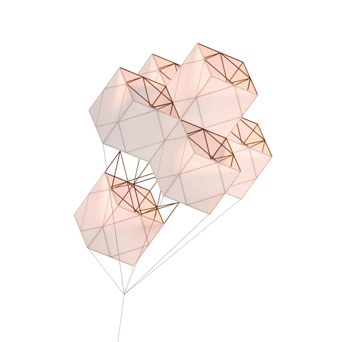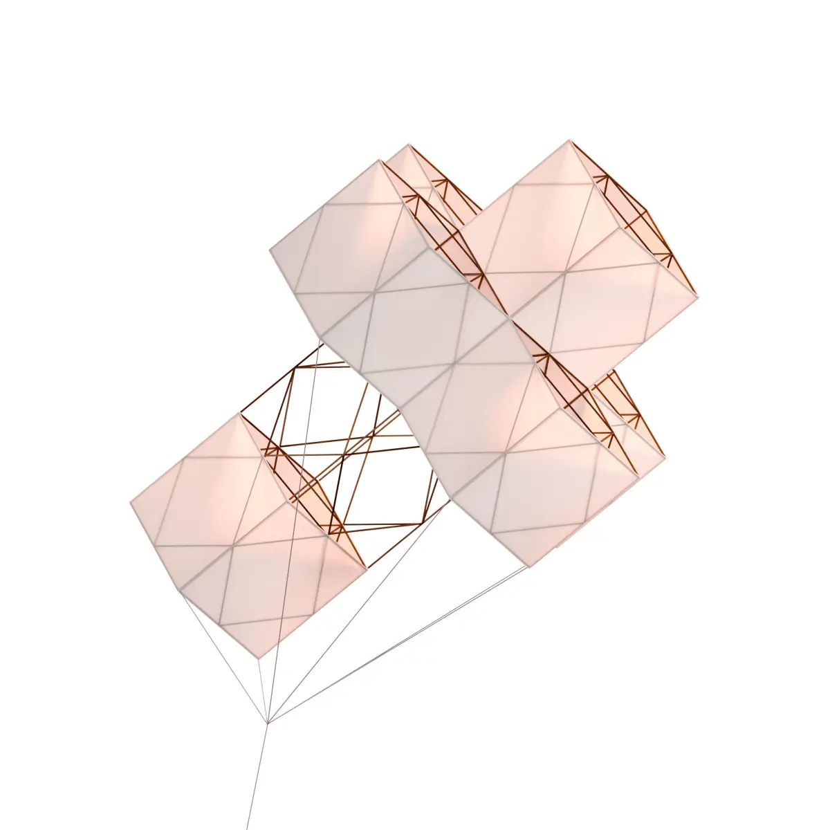 Flying kite, with straight geometric shapes, cubes of the correct shape are collected together in the form of a three-dimensional cross. The base of the aircraft is made of a light wooden frame, which is covered with white translucent fabric or paper.Dimensions: 200cm x 150cm x 150cm