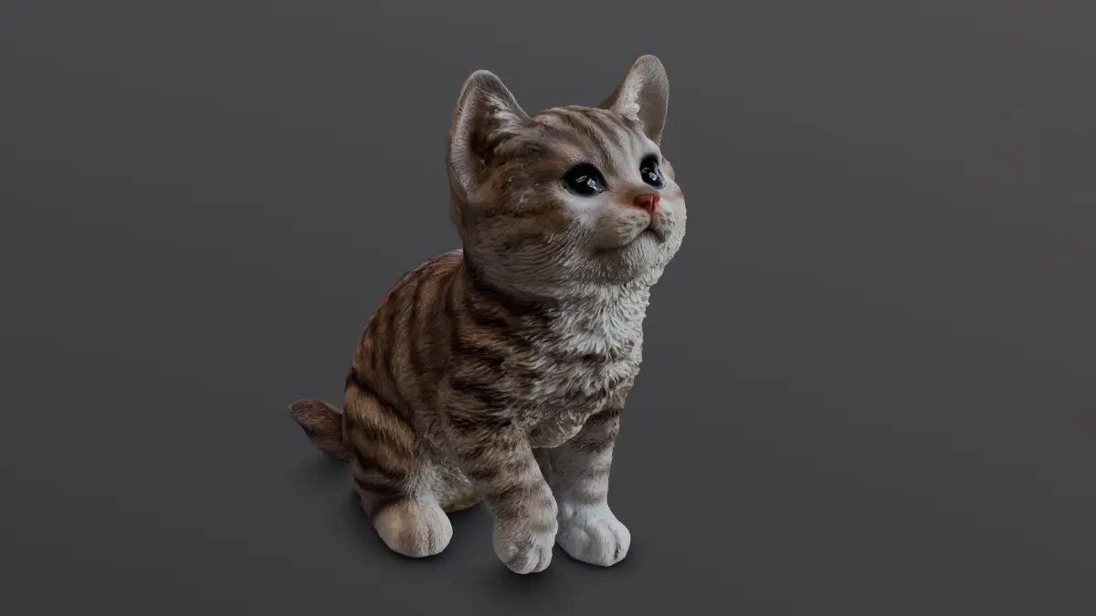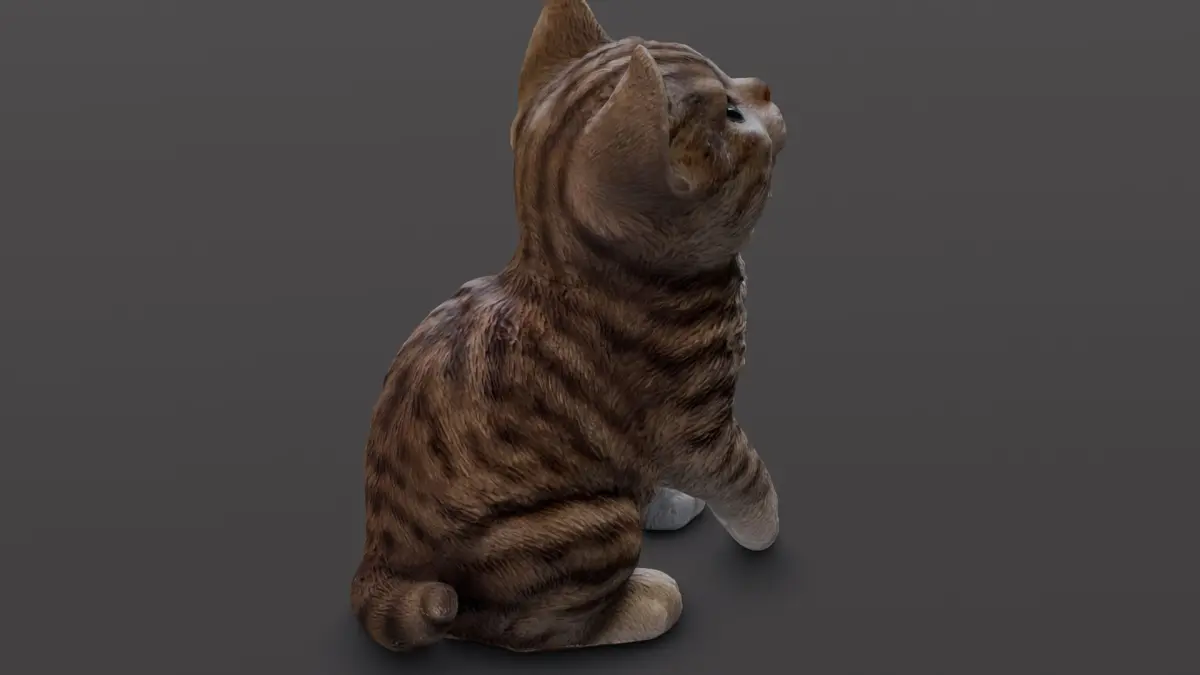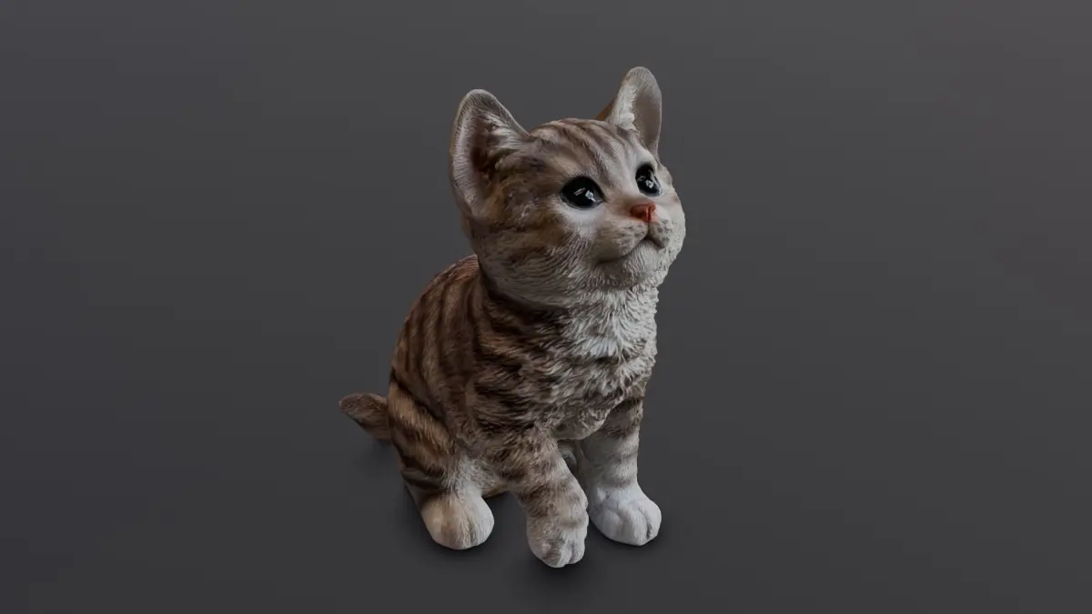 Textures have been thoughtfully applied to the model to enhance visual detail and realism, while various materials define the surface properties of the kitten, capturing its furry appearance and lifelike qualities.