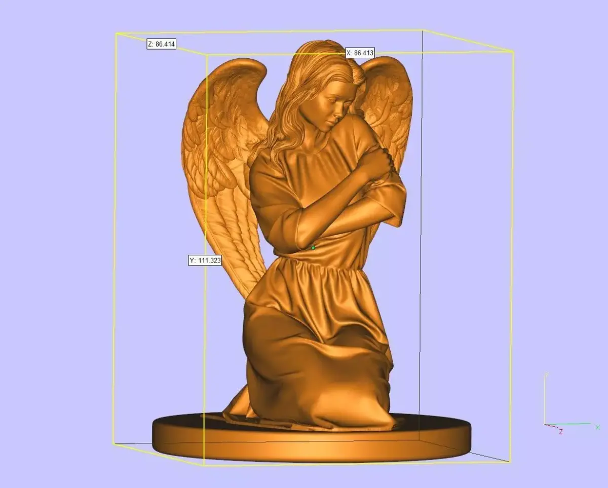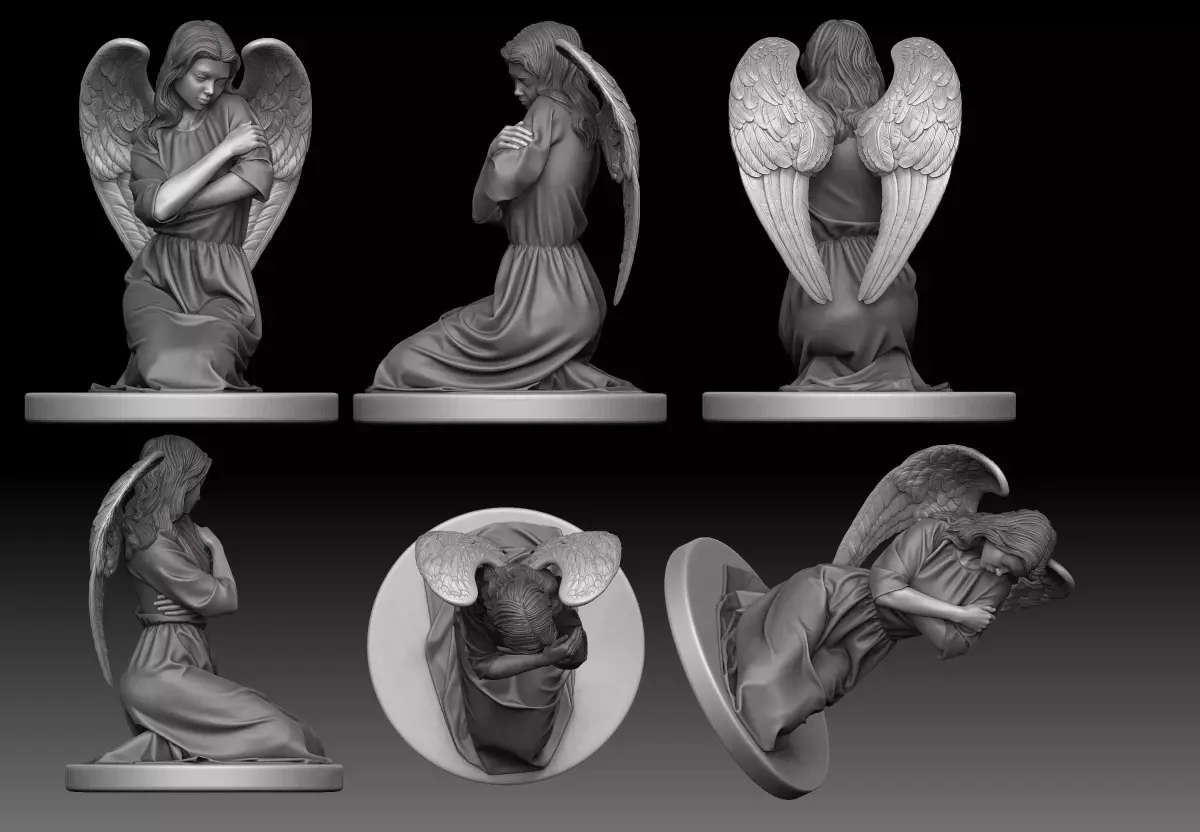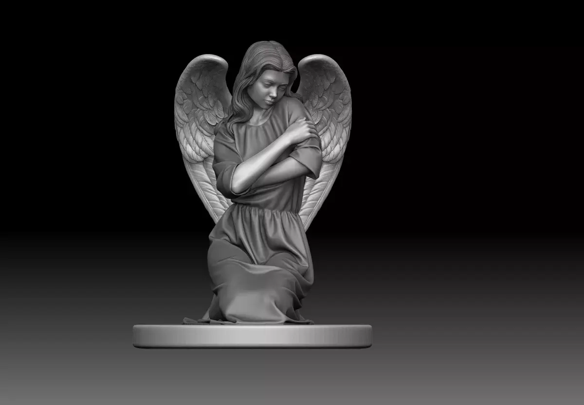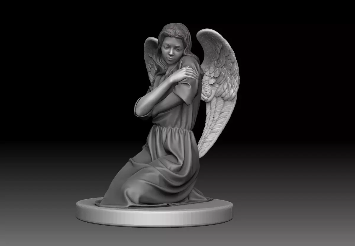 This high-quality STL 3D model depicts a graceful kneeling angel with finely sculpted details, flowing dress folds, and realistic feathered wings. The model captures a serene and peaceful expression, perfect for religious art, decorative sculptures, or commemorative projects.