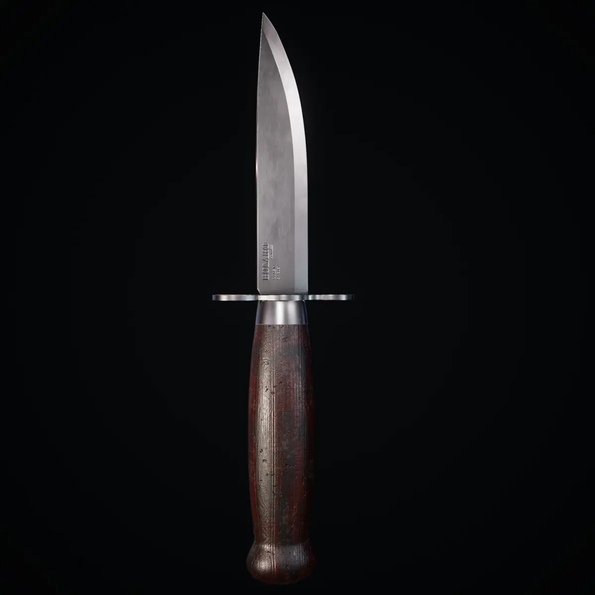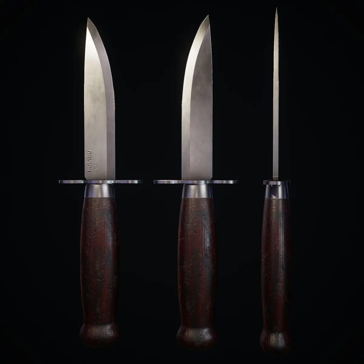 A Very Detailed Low Poly Knife with High-Quality PBR Textures. The blade has a detailed steel base, and the handle is made by a dark wood.