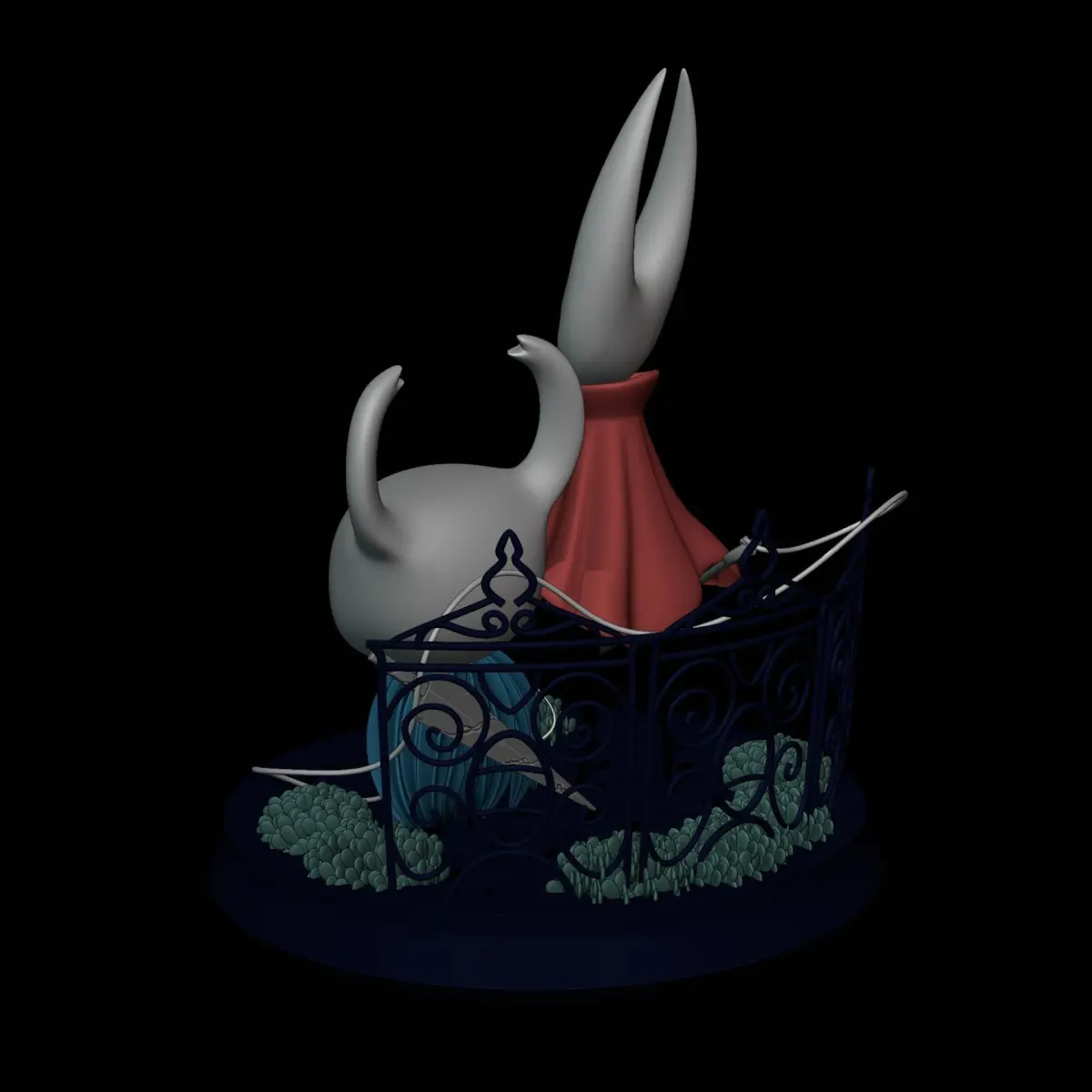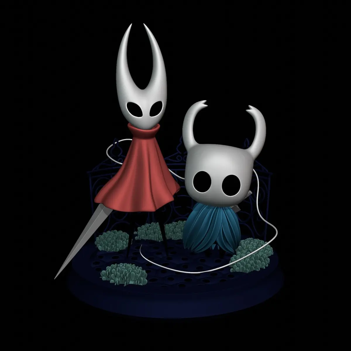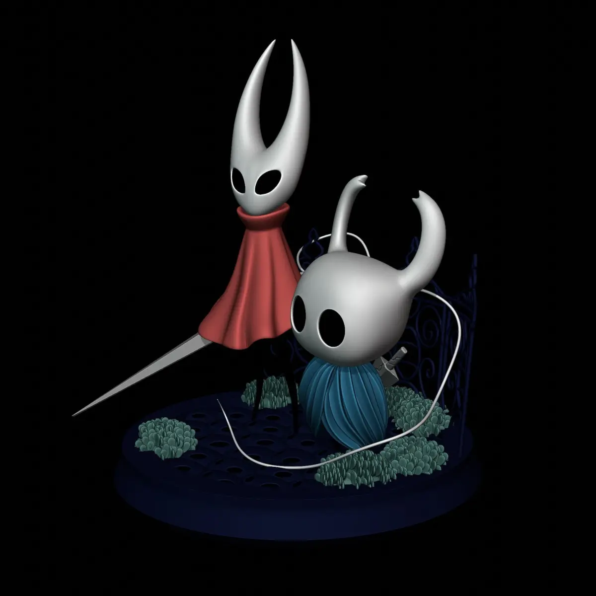 A digital sculpture of 'Knight' a small insect knight with a broken sword and his characteristic blue cloak and 'Hornet' covered in his red cloak and with his needle to sew up his enemies. Straight out of 'Team Cherry' gaming masterpiece 'Hollow knight'. Includes two versions of the characters:
