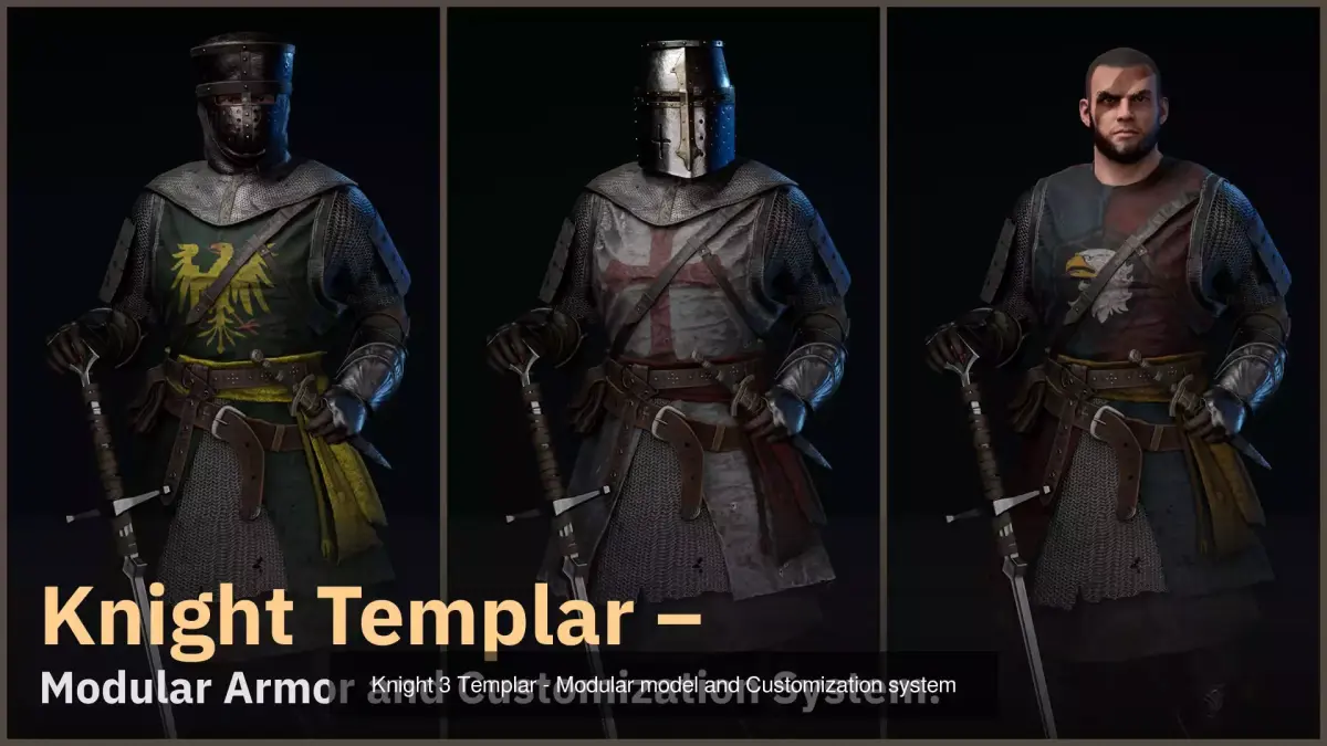 Every piece of armor and every weapon is modular, game-ready, and compatible with socket-based attachment systems. Shields support heraldry and paint customization. Weapons are stylized to fit a grounded medieval aesthetic.
