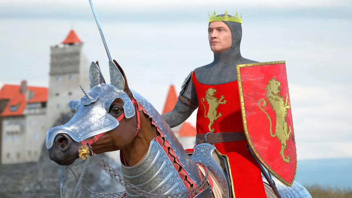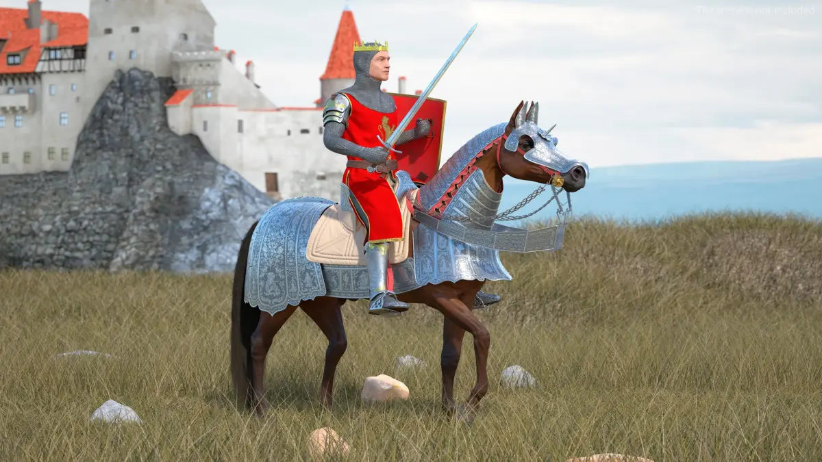 Knight King on Horseback in Armor Fur is a three-dimensional model of knight king with sword and golden crown, who is holding a sword and riding a fully armored horse.