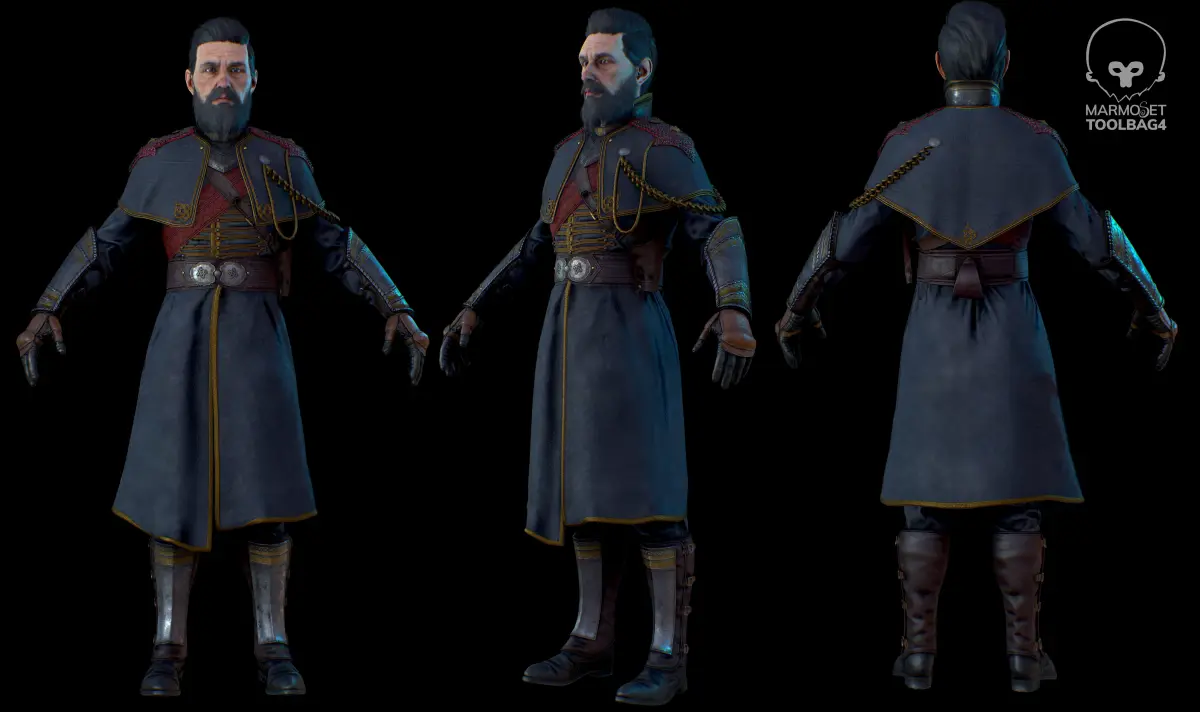 Model inspired by the world of the order 1886 .OBJ,FBX,Max2019 y marmoset toolbag escene included Created in zbrush, painted in substance painter and render in marmoset toolbag 9 textures:Accessory(2048x2048)Hair(512x512)Leg(2048x2048)--AO-roughness-metallic(1024x1024)Suit(1024x1024)---Normalmap-Fuzzmap(2048x2048)Beard(512x512)Eye(512x512)Metal(2048x2048)-----AO-roughness-metallic(1024x1024)Head(1024x1024)-----Cavity map(256x256)-scatter map(512x512)-SSSmap(256x256)Teeth(512x512)