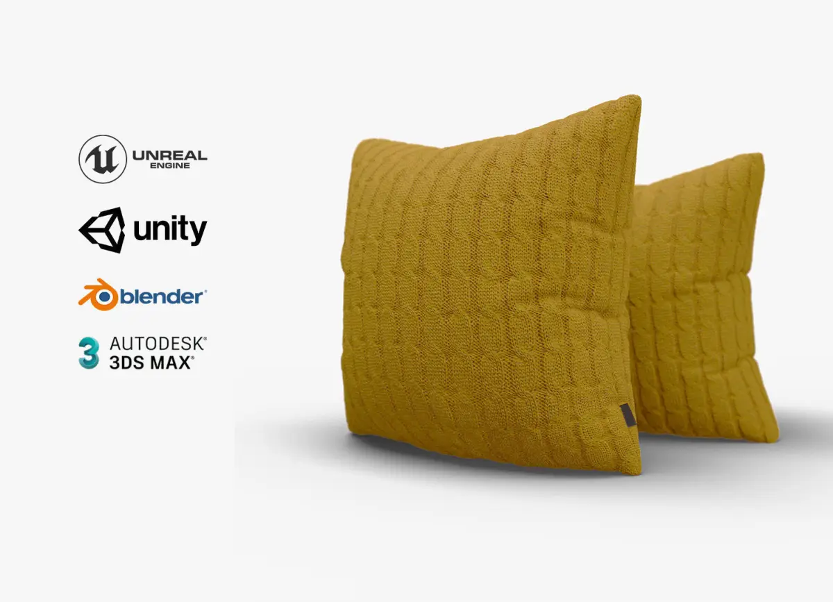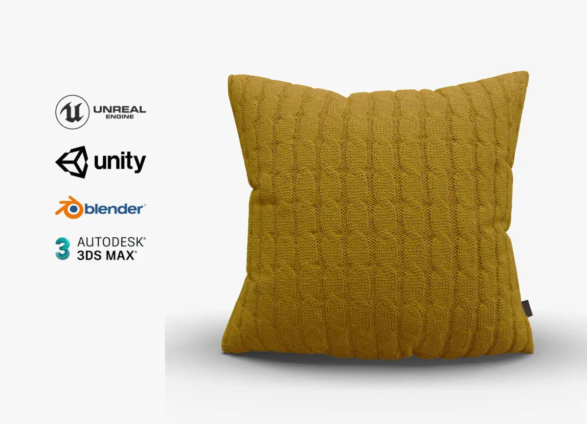 Just a simple but beatiful knitted cushion with a chain pattern, color mustard, low poly count yet enough vertices to ensure a good and smooth deformation, it includes 2 positions, one up right and another one laying down.