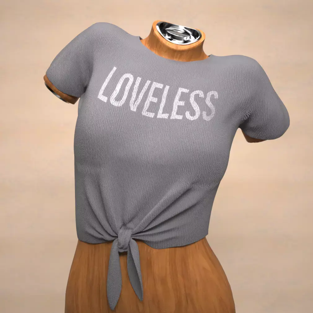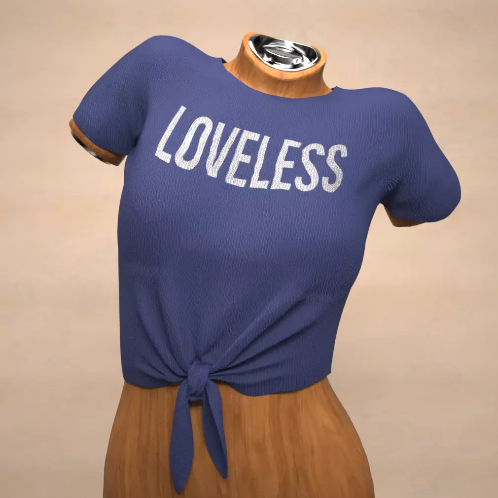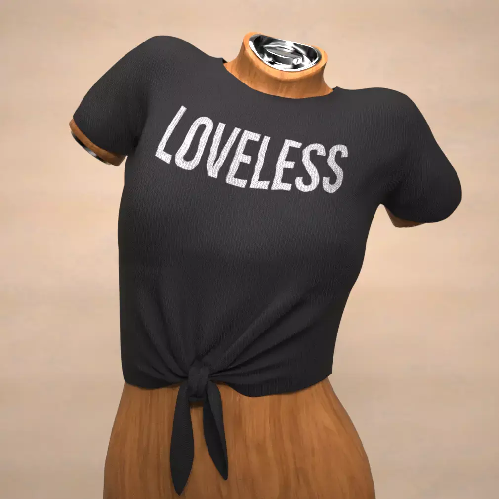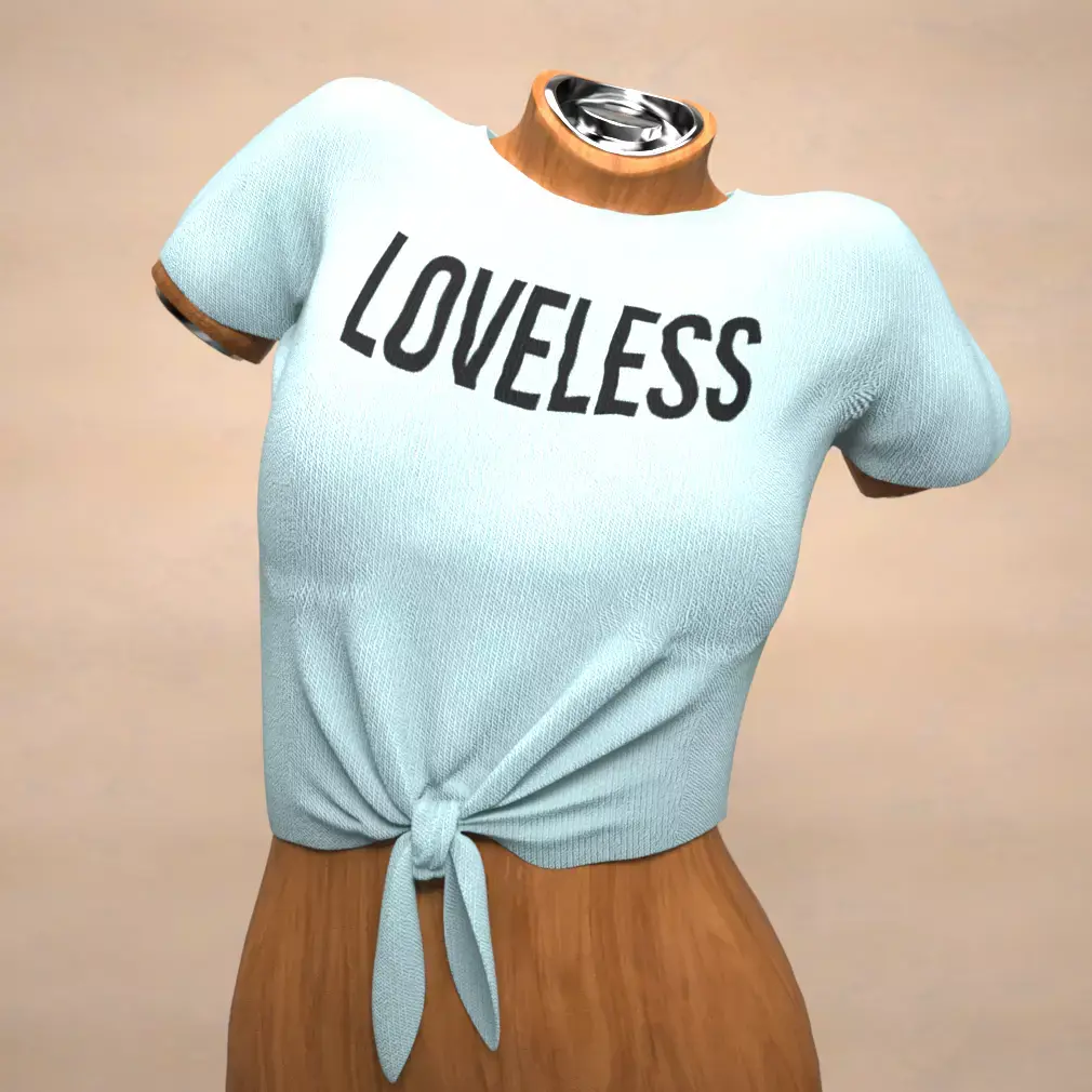 The shirt comes in 8 different colors (Azure, Black, Blue, Default White, Gray, Green, Peach, and Red), which can be found in the Material subfolder. To ensure the design always pops, the LOVELESS text automatically swaps colors based on the fabric: dark fabrics feature a white print, while light fabrics feature a black print.