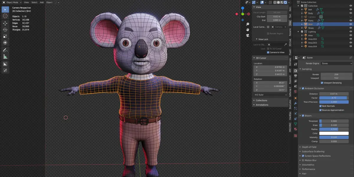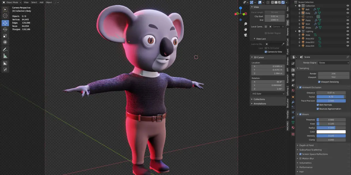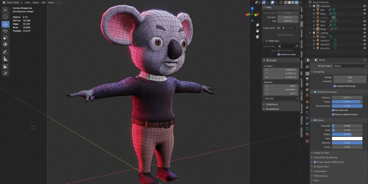 3D Modeling of a koala named Jety with full-body, clothes, mouth, tongue, shoes