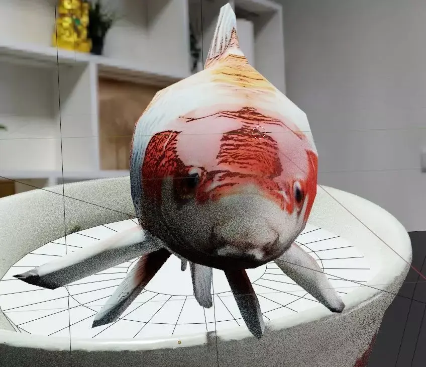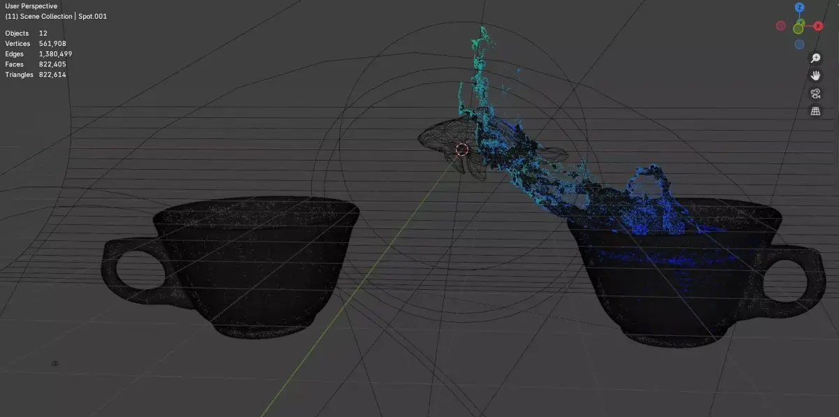 Koi Fish jumping out of a teacupThe Koi Fish itself is somehwat low-poly with only 504 vertices and 522 triangleswhile the cups and water has a lot of resolutionBaked with water simulation in Blender