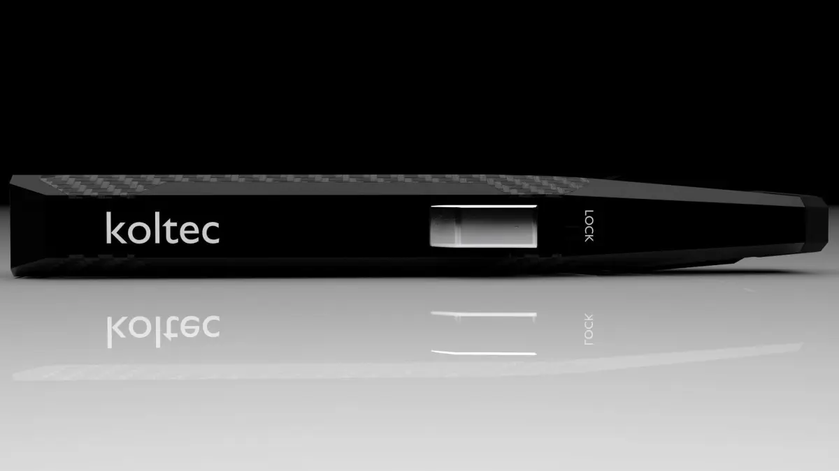 This 3D model represents a sleek, modern locking mechanism device branded with Koltec. The design combines precision engineering with a stylish, minimalist appearance. Crafted with high-detail textures, the model features a durable carbon fiber finish on the surface, complemented by a metallic lock button on the side.