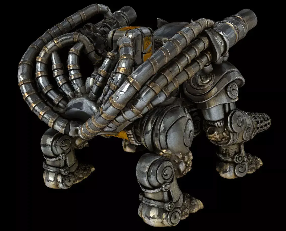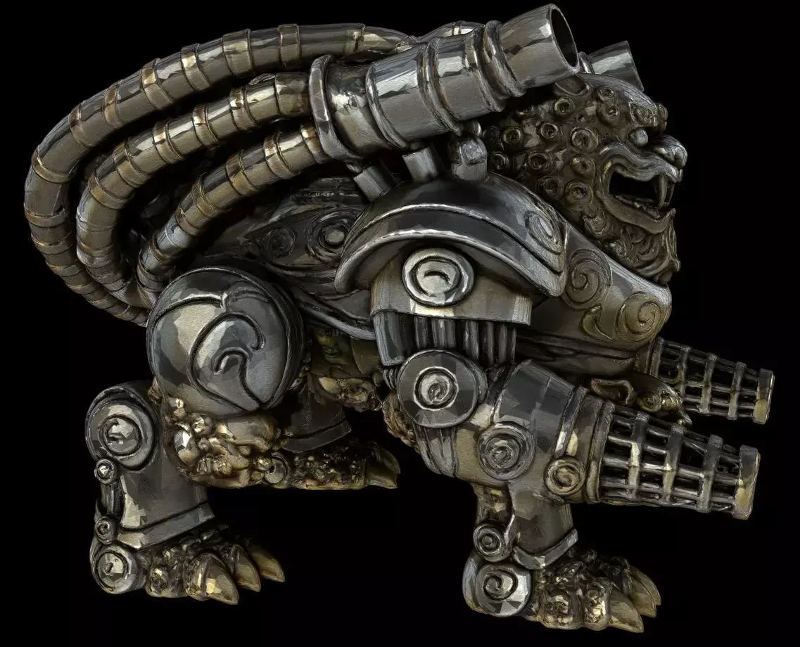 A high-detail 3D model of a mechanized Komainu (狛犬) — redesigned as a quad-legged guardian robot.This sculpt blends traditional Japanese guardian-lion motifs with heavy sci-fi armor, mechanical limbs, and powerful weapon systems.