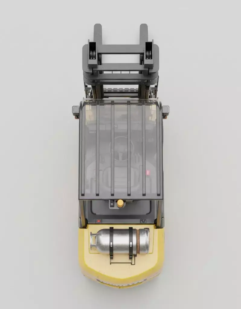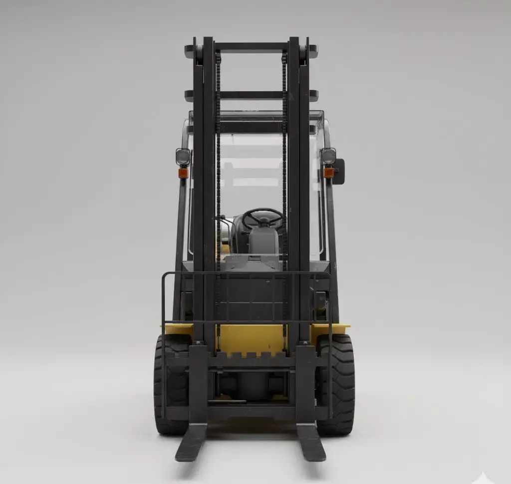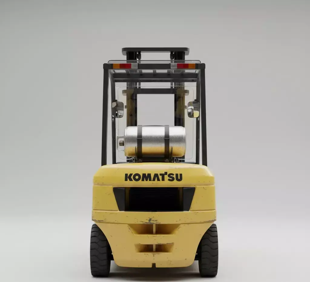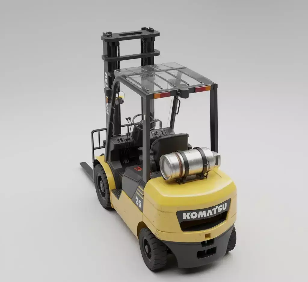 This comprehensive project presents a professional, high-fidelity 3D model of a Komatsu forklift, meticulously designed for industrial visualization and simulation applications. The model showcases a vibrant yellow body with realistic signs of wear and tear, including subtle scratches and dirt accumulation, adding to its authentic appearance. Every critical component, from the sturdy black mast and forks to the detailed cabin interior with its steering wheel, gauges, and operator seat, has been accurately rendered.The transparent overhead guard and windshield provide a clear view of the controls, enhancing the realism. Prominent KOMATSU branding is precisely placed on the rear counterweight and along the side of the mast, alongside 25 markings, reflecting specific model identification. A silver LPG tank is securely mounted on the rear, complete with realistic metallic textures. The model includes functional lighting elements and mirrors, contributing to its operational authenticity. The robust black tires feature realistic tread patterns, and the overall construction emphasizes durability and industrial utility. This asset is perfect for architectural visualizations, logistics simulations, and digital product demonstrations requiring a top-tier forklift representation.