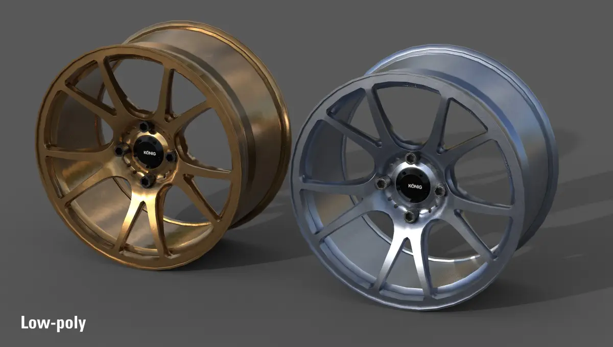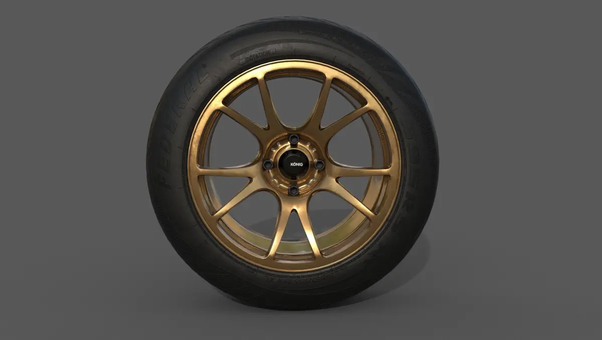 This Model includes the König Freeform 15x9.5 4 lug nuts rims. these come in two different colors (bronze and silver) and in low and high poly.