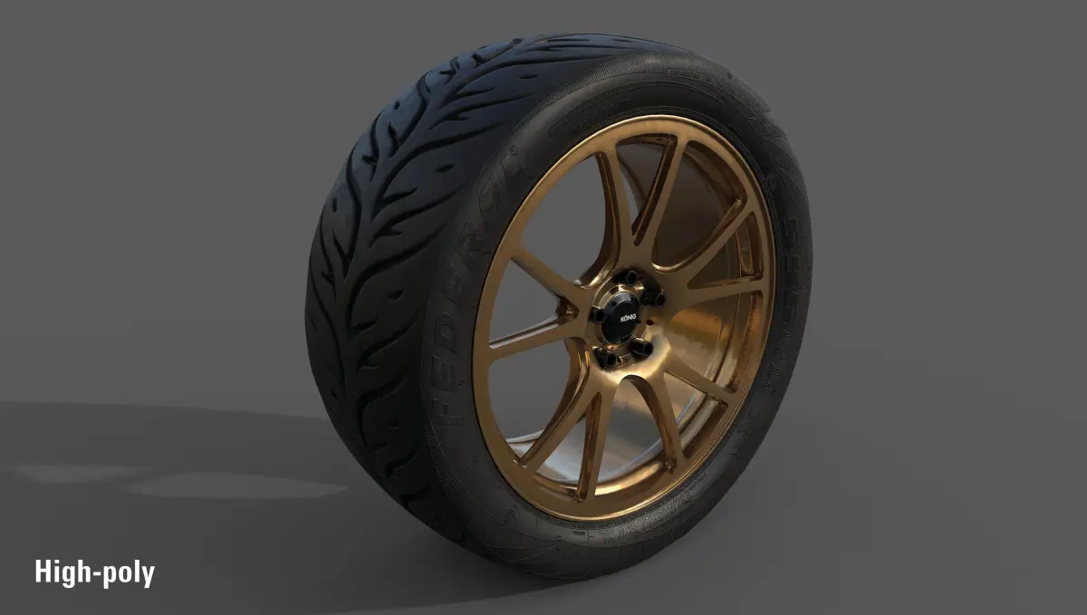 This Model includes the König Freeform 17x8 5 Lug Nuts with Federal 595 RS-RR 235/40. The rims comes with two colors (bronze and silver) in low and high poly. The Tire comes in low poly (flat tire profile), mid poly and high poly.