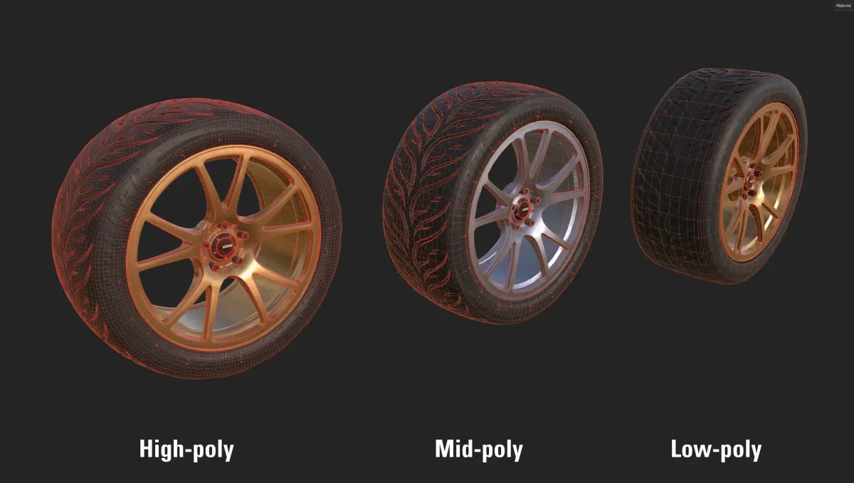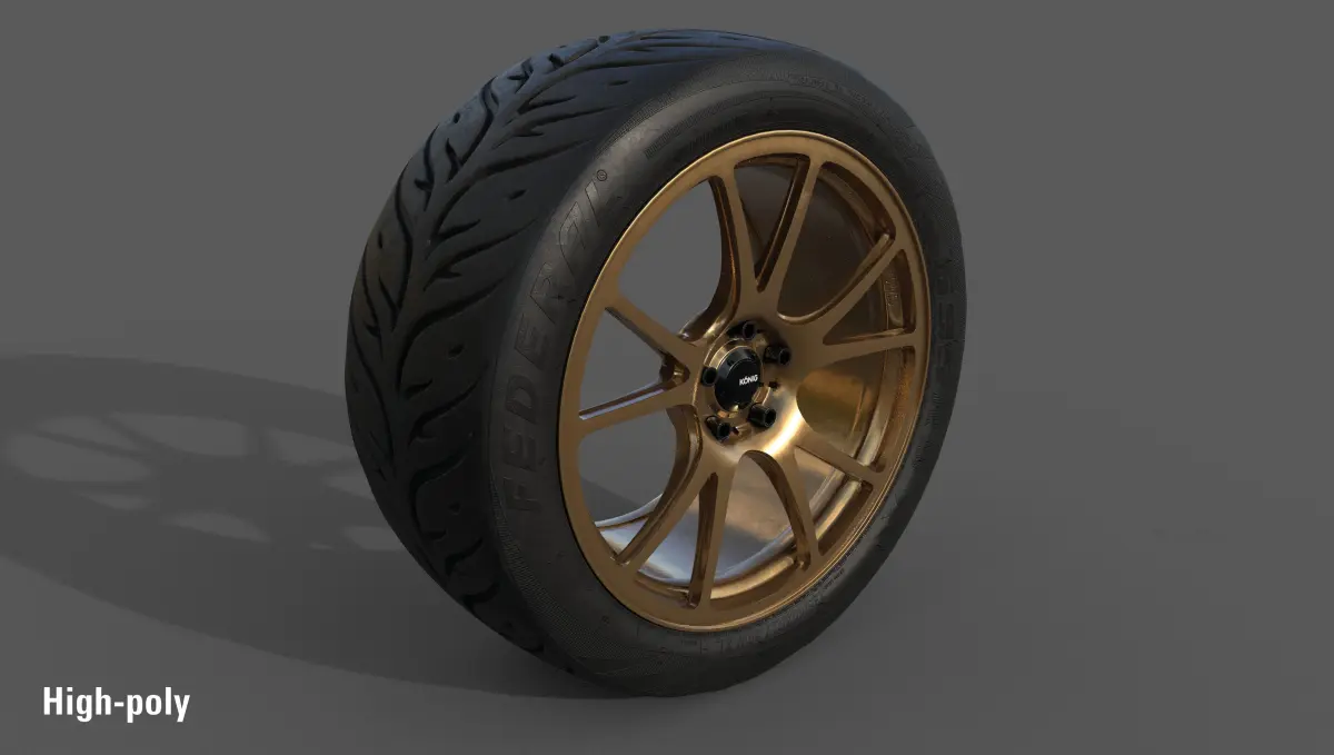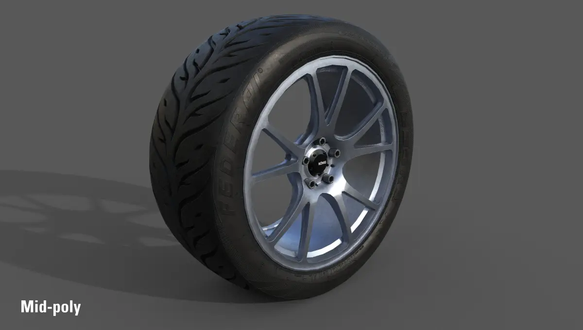 This Model includes the König Freeform 17x9 5 Lug Nuts with Federal 595 RS-RR 235/40. The rims comes with two colors (bronze and silver) in low and high poly. The Tire comes in low poly (flat tire profile), mid poly and high poly.