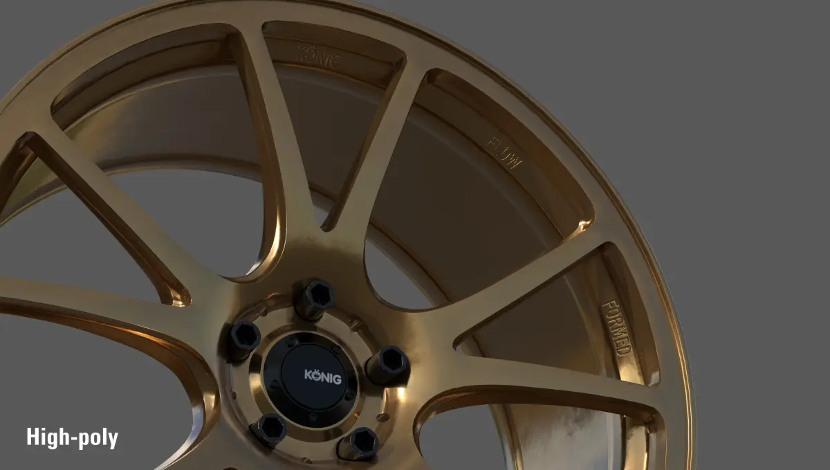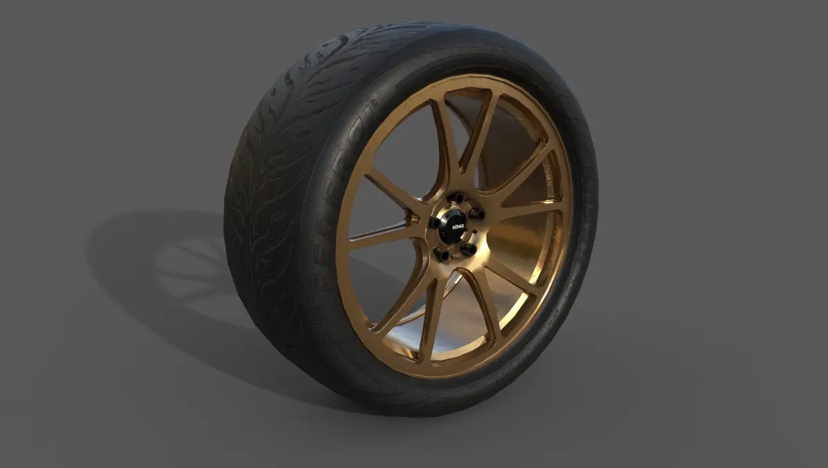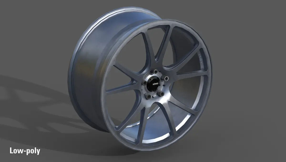 This Model includes the König Freeform 18x8 5 lug nuts rims. These come in two different colors (bronze and silver) and in low and high poly.