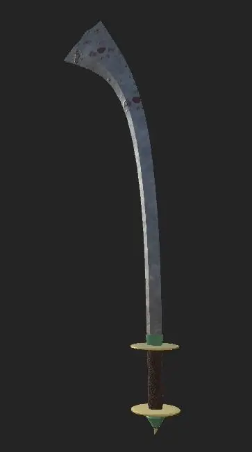 Object description: The Kora is a sword-type sidearm used in the Indian subcontinent, including Nepal. It has a massive and curved blade, sharp on the concave side. The handle is single-handed, with a wooden handle, jade decorations and a dog's tooth set at the tip of the handle.
