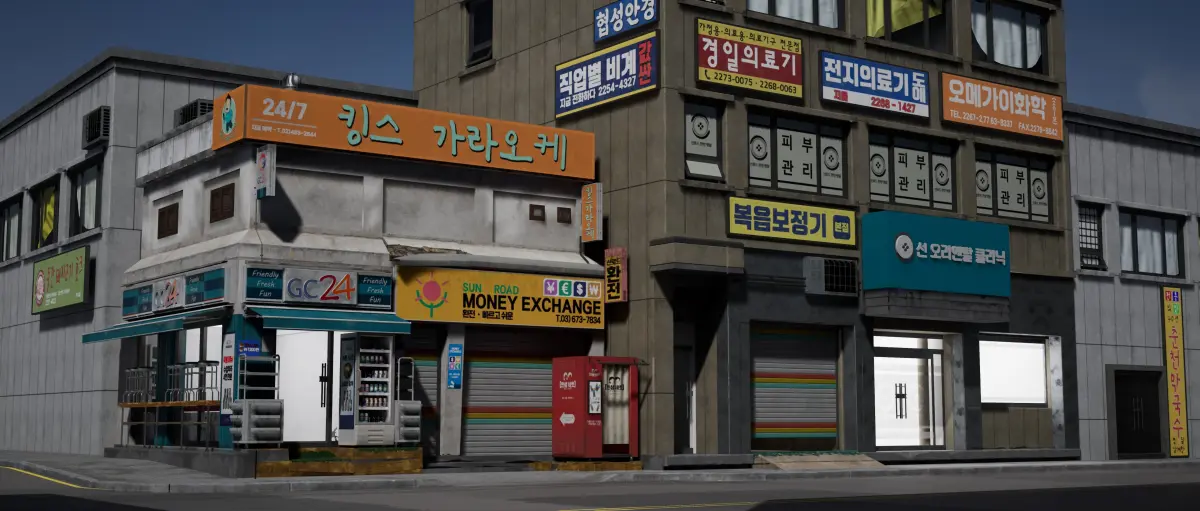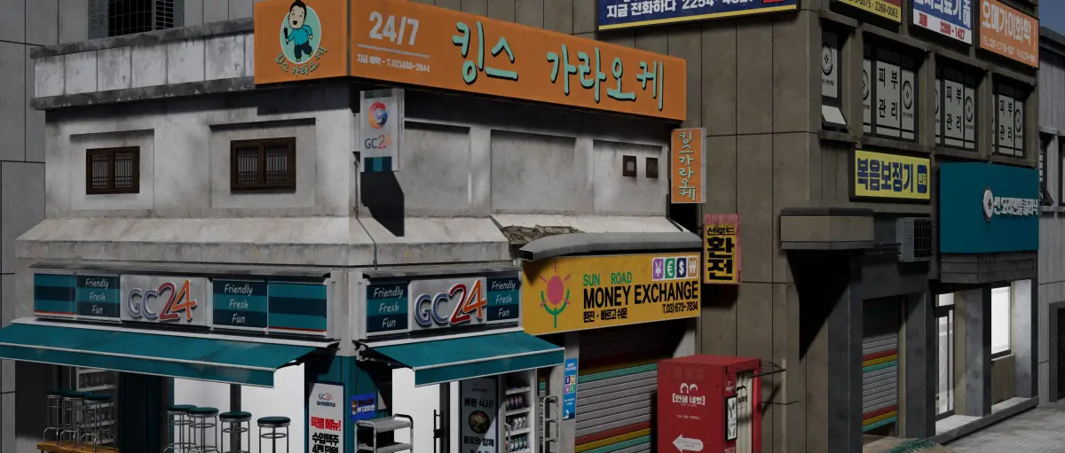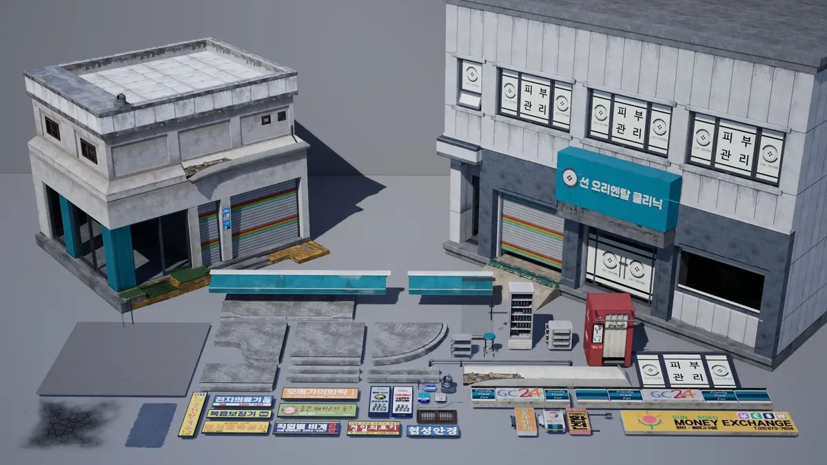 This pack contains a GC24 corner shop with empty interior ready for assets. A second building with ground floor and modular upper floors to add as many floors as you want.Also many individual assets to populate a scene.