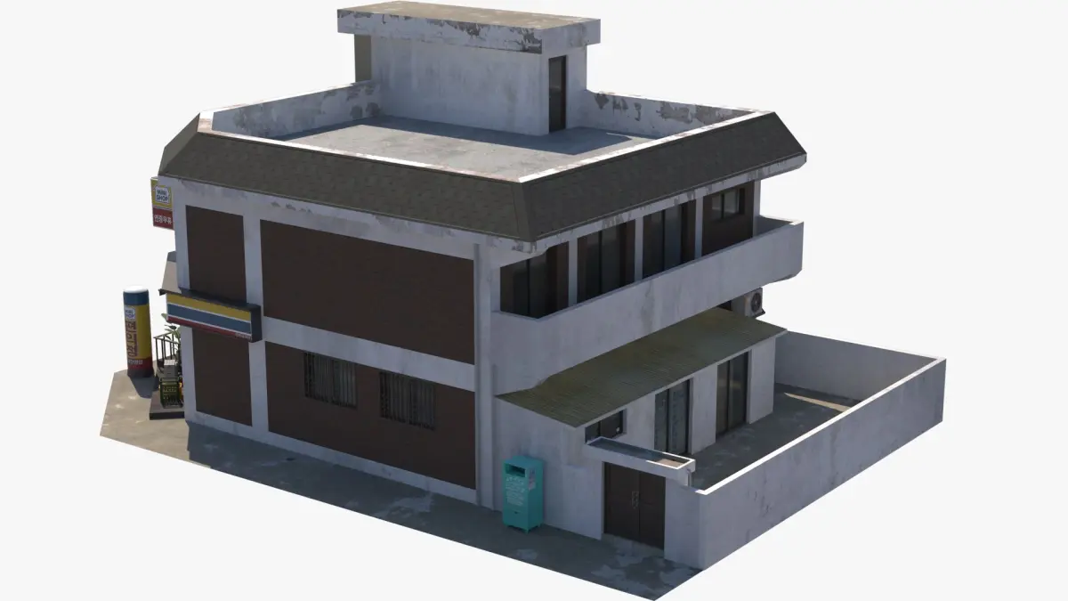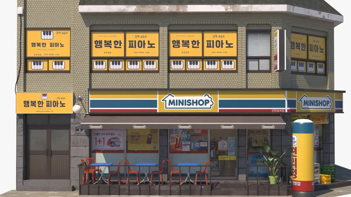 Typical South Korean residential building with a mini market and a store on the ground floor.