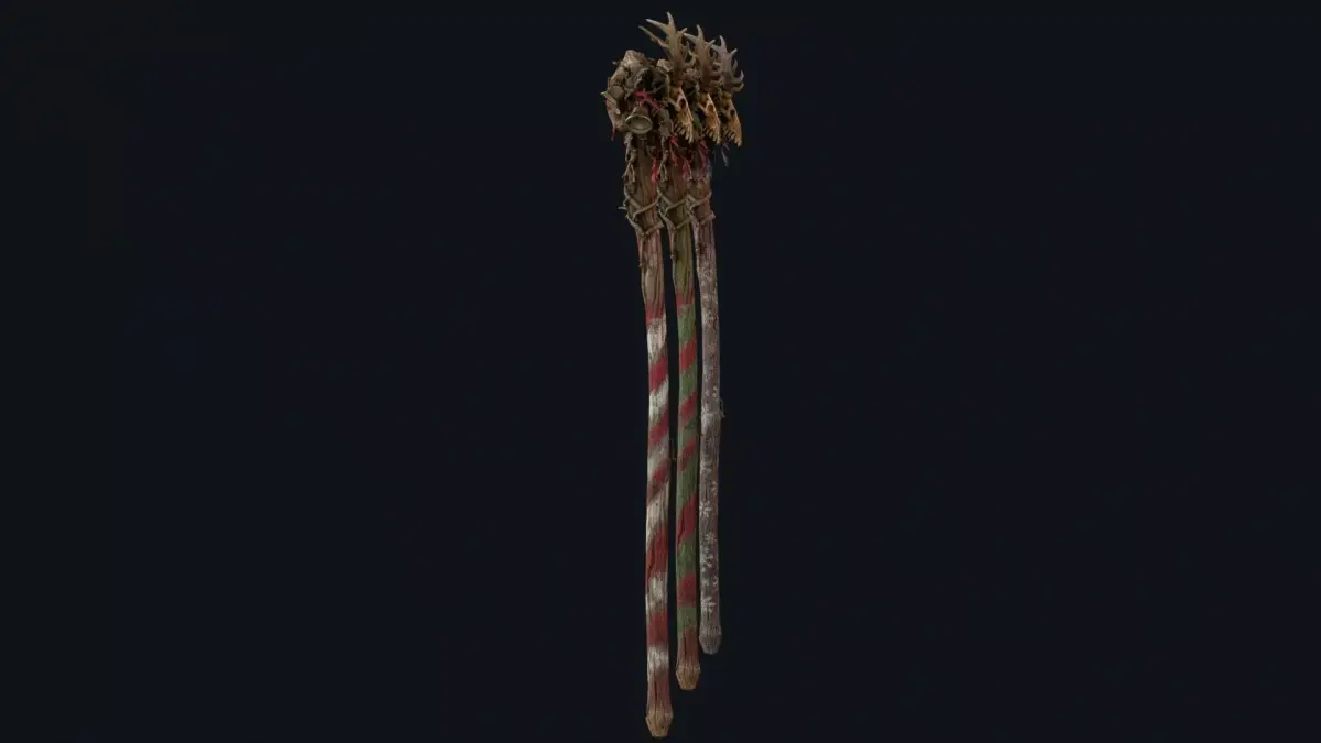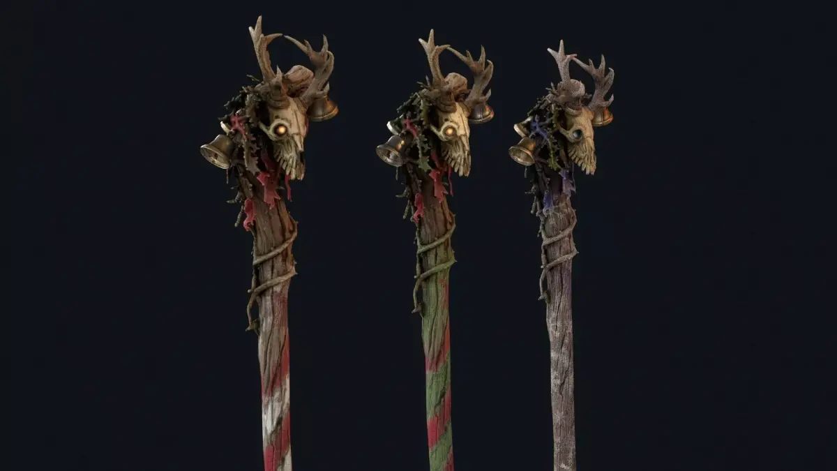 The model features a carved wooden stick topped with a sinister skull, enhancing its eerie silhouette and storytelling presence. It includes PBR textures and is prepared for easy integration into game engines. The handle is positioned at world zero for convenient placement and attachment, and the model is oriented along the Z axis. The asset includes 2K and 4K textures, making it suitable for optimized real-time use as well as more detailed cinematic scenes.