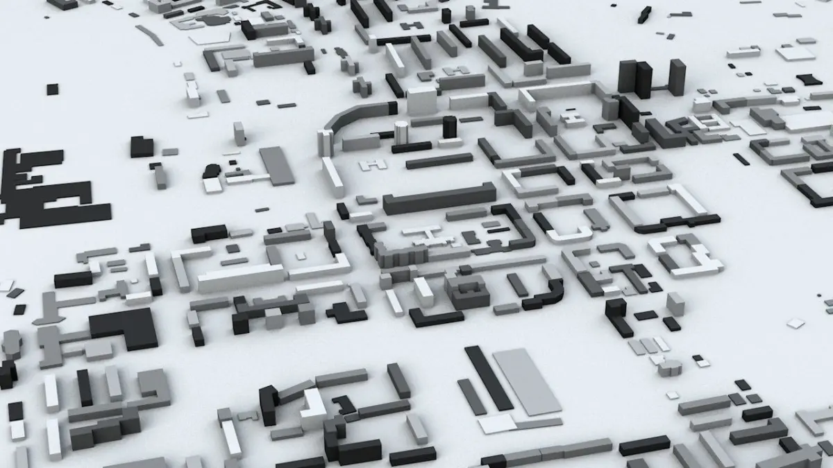 - the model is positioned on a flatv surface (all buildings are on the “floor” - no elevation data included)v