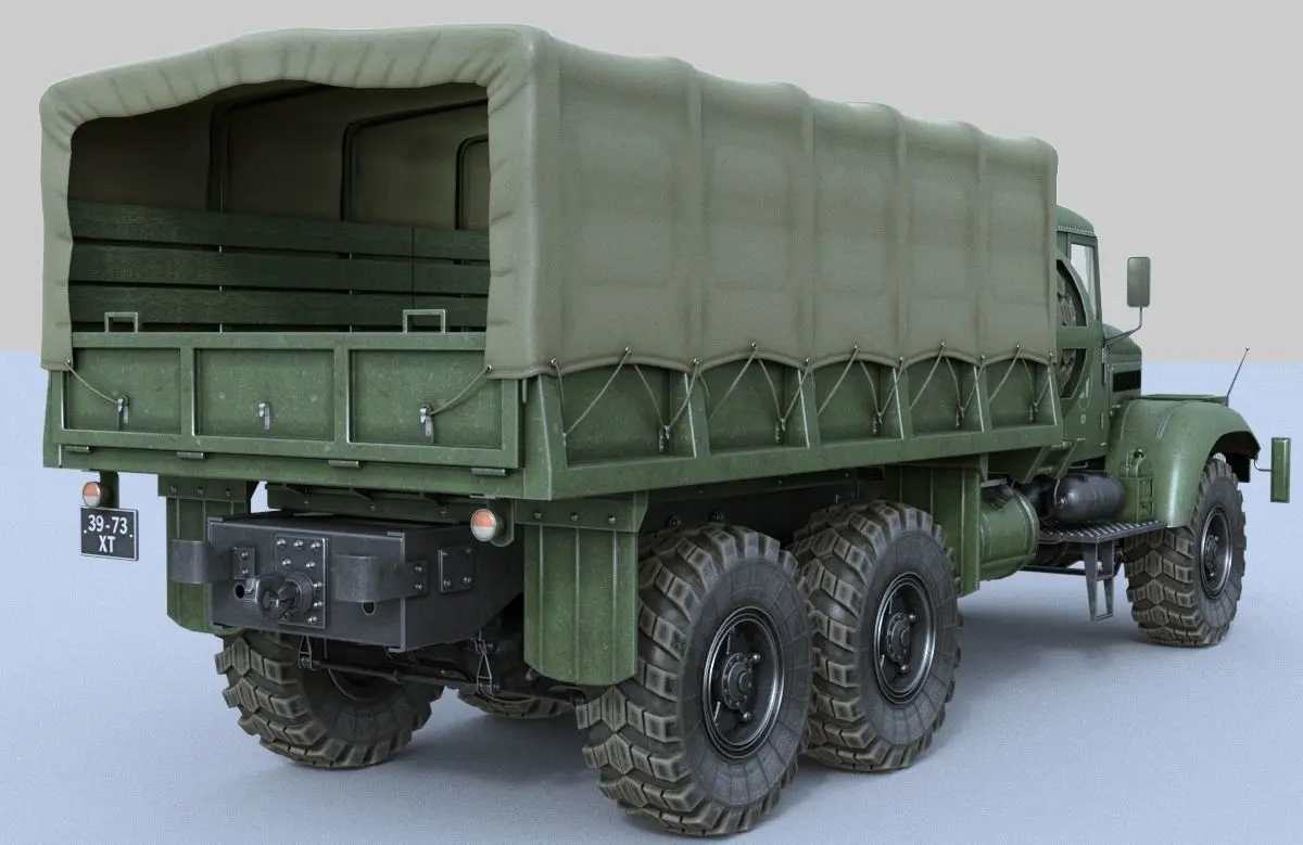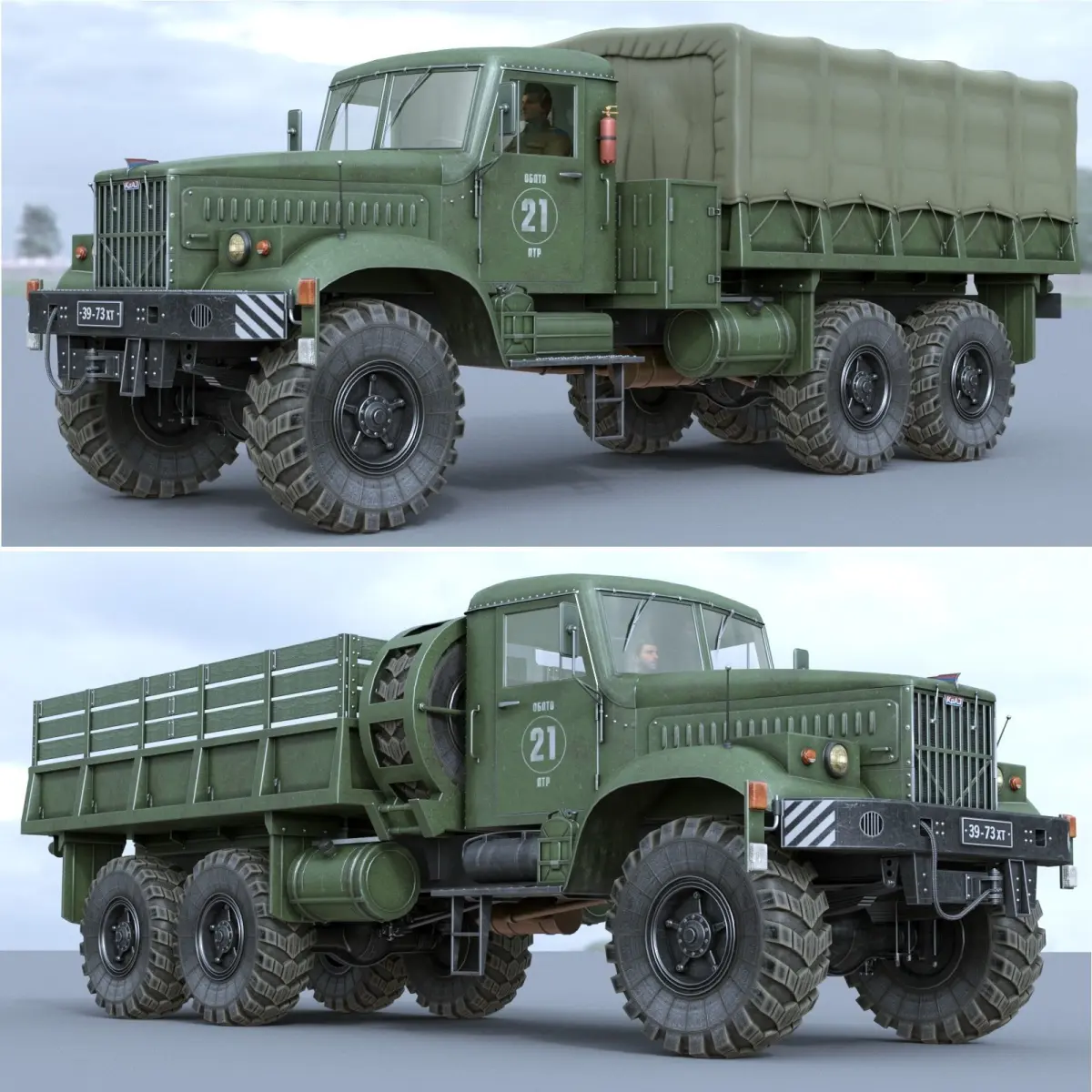 KRAZ-255 - heavy truck (6x6) made in USSR (Ukraine, Kremenchug automobile plant) - this model represents army variant from airfield service battalion.3dsMax + FBX_OBJ, render - Corona (! Attention - materials for Corona, the main model - 3dsMax - not imported into Blender - only for professional 3d programs).In the package is remodeled all: exterior, interior, instrumentation, running gear, diesel engine (YaMZ), driver. Animation: Engine capot (0-25-50), doors (50-100). All parts of the model are divided into logical layers - by disabling the corresponding layer you can get 2 variants: