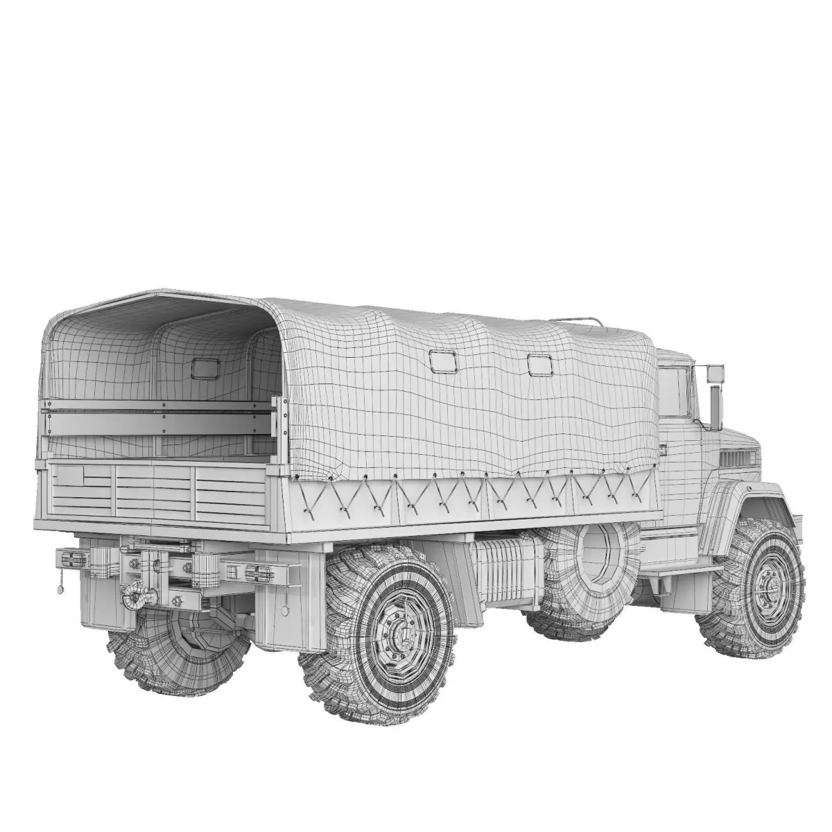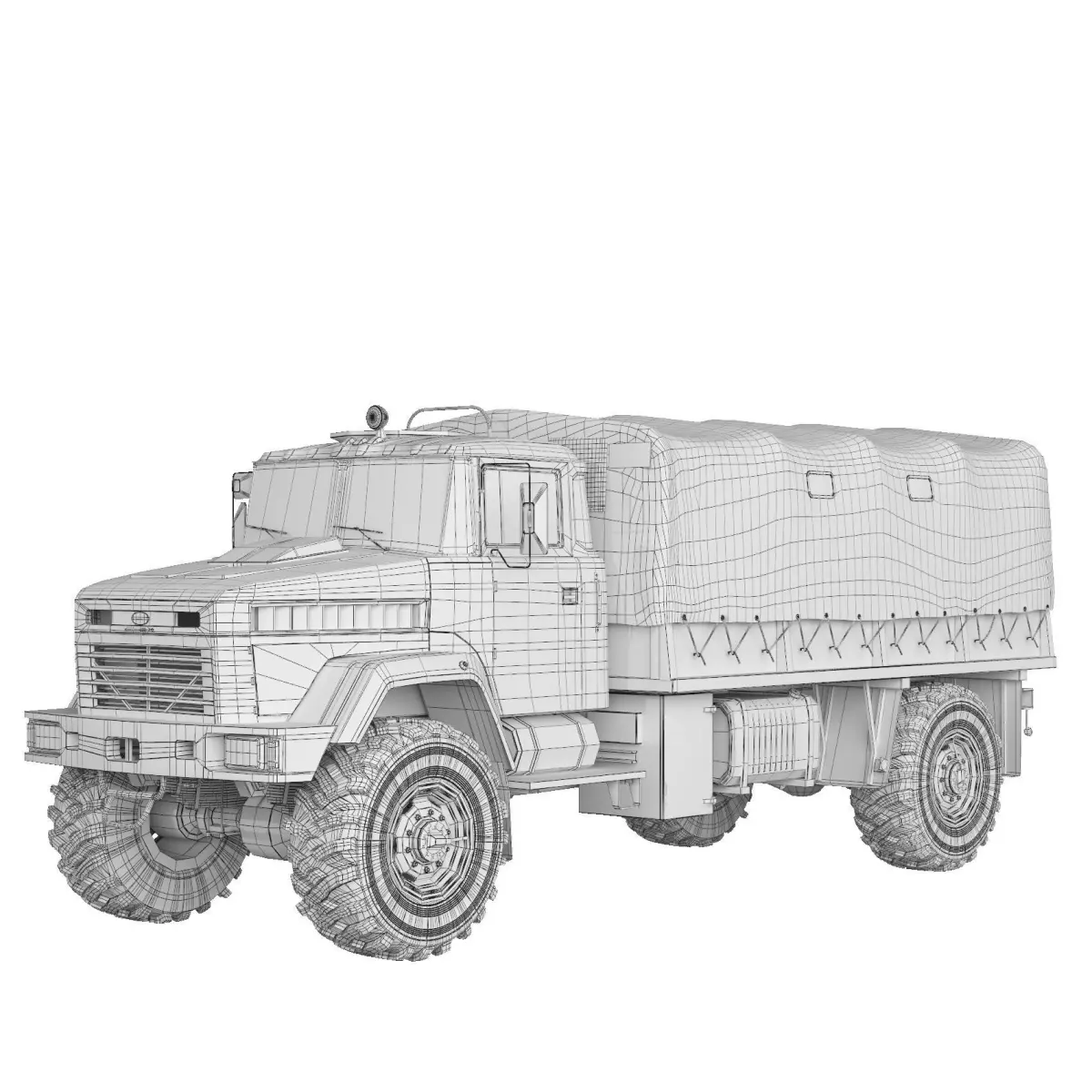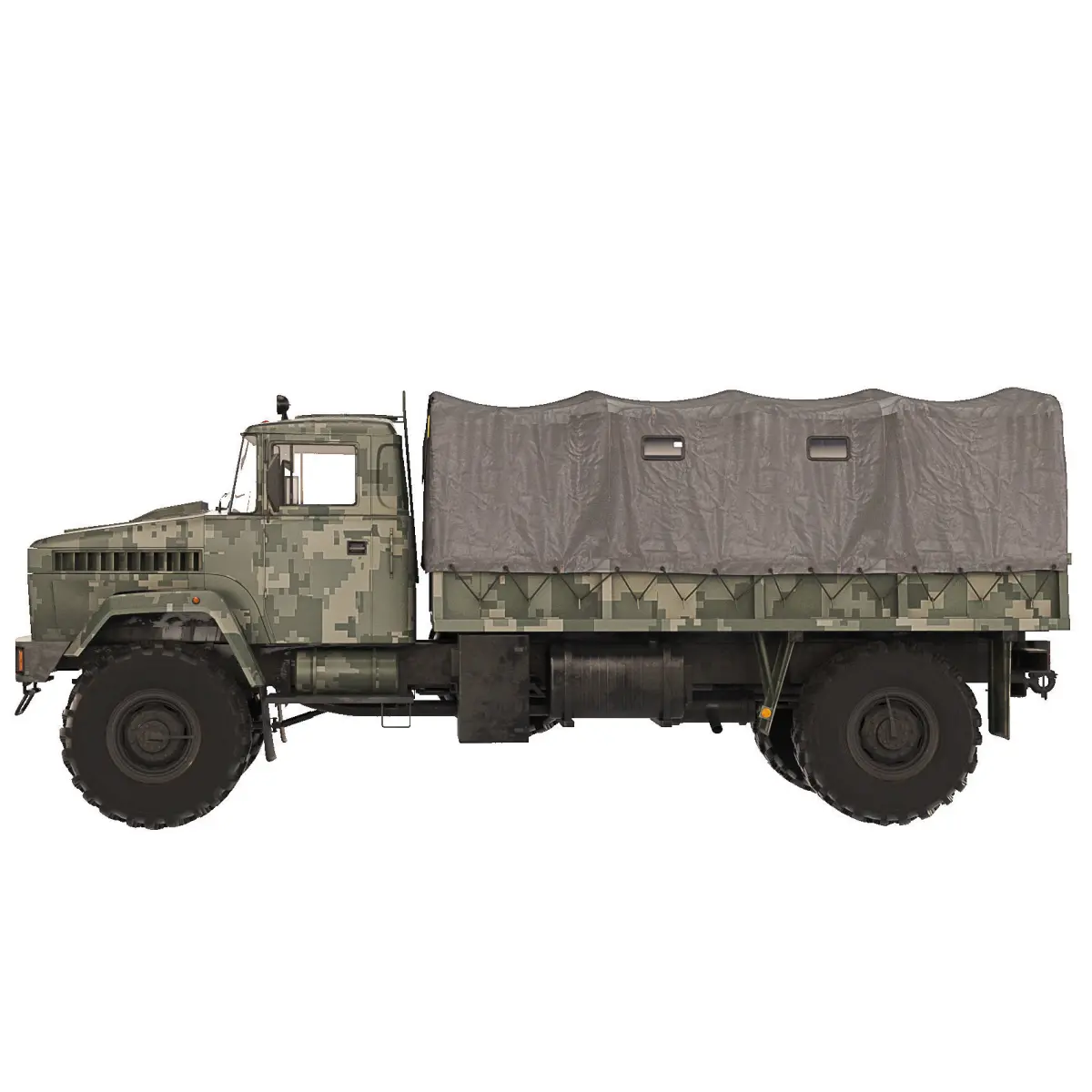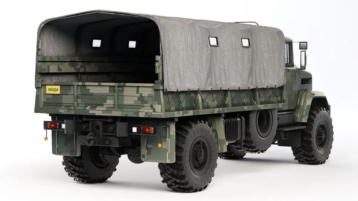 KrAZ-5233 BE Spetsnaz is a multifunctional off-road vehicle for transporting military personnel and cargo, towing artillery systems with a caliber of up to 152 mm, transport and special trailers on all types of roads and off-road. It is equipped with a cab with an opening hatch on the right side of the roof and is equipped with a tarpaulin side platform.