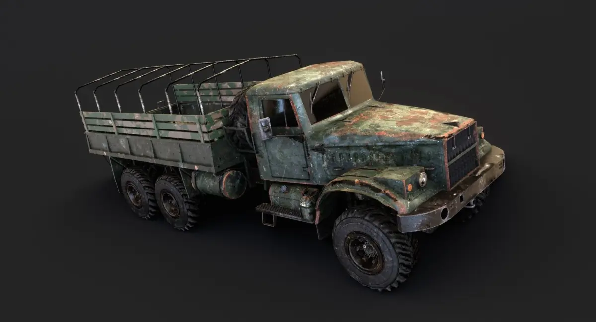 This is a low-poly model of the KRAZ 225 - a Russian military utility truck, slightly rusted and with heavy usage marks, suitable for environments with a post-apo and similar styles.