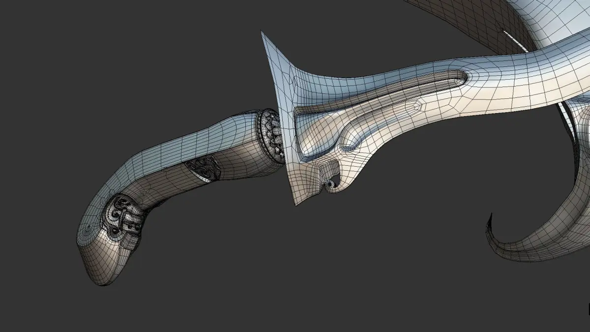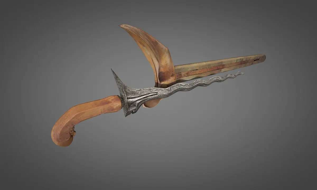 Kris (Ngoko Javanese: keris) - is an asymmetrical dagger with distinctive blade patterning. While most strongly associated with the culture of Indonesia the Kris is also indigenous to Malaysia, Thailand, Brunei and Singapore. There are several different types of Kris. Curvy blade symbolizes a sacred snake Naga. The handle is made in the style of “Kraton”, which is typical for East Java, Sumatra and Yokohama. The scabbard throat is performed in a shape of pirigue and presumably symbolizes the “moon boat”, where according to the legend Javanese hero Panji lives.
