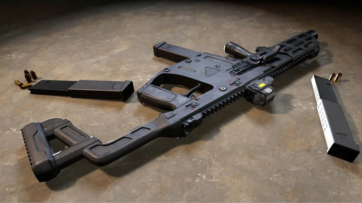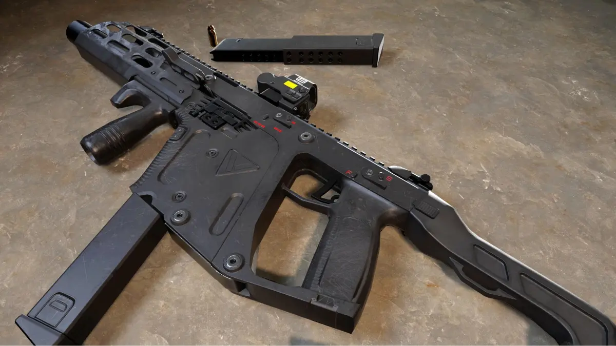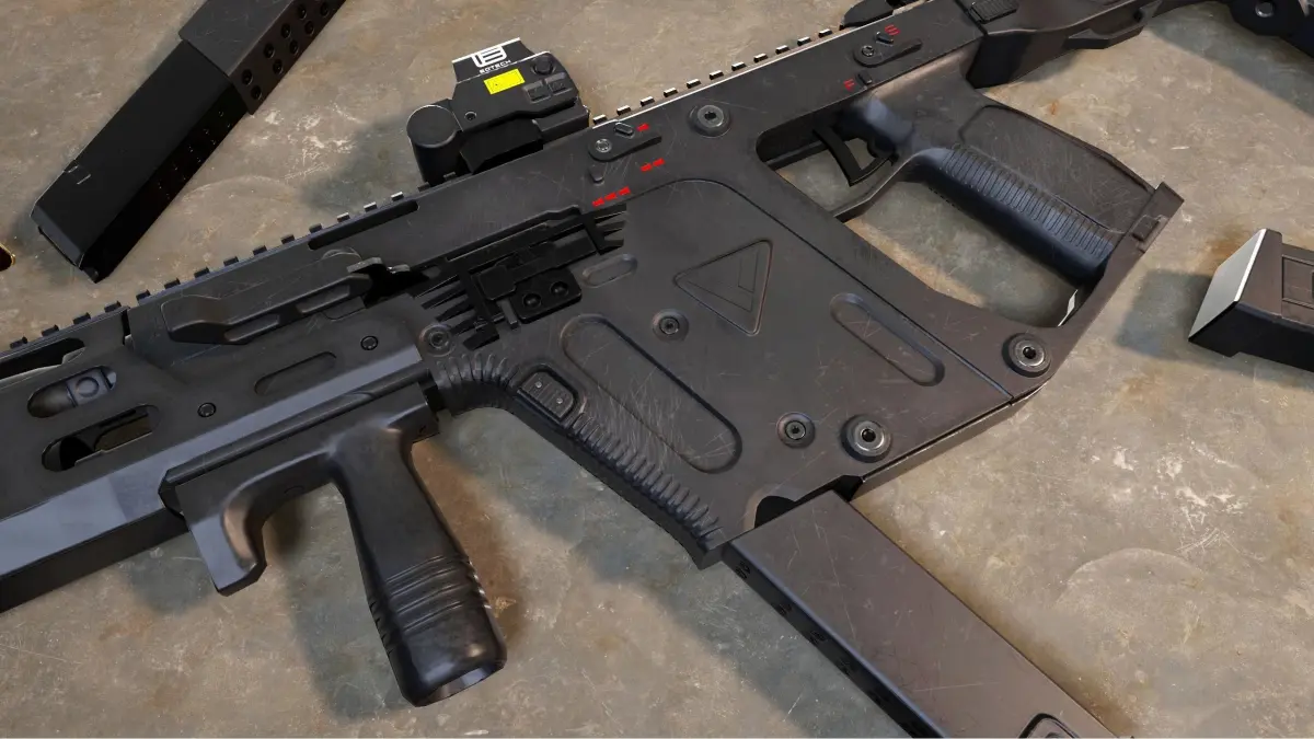 Kriss Vector submachine gun model. Game-ready low poly, PBR metal-rough textures. Includes suppressor, stock, holographic sight, magazine and ammunition models.