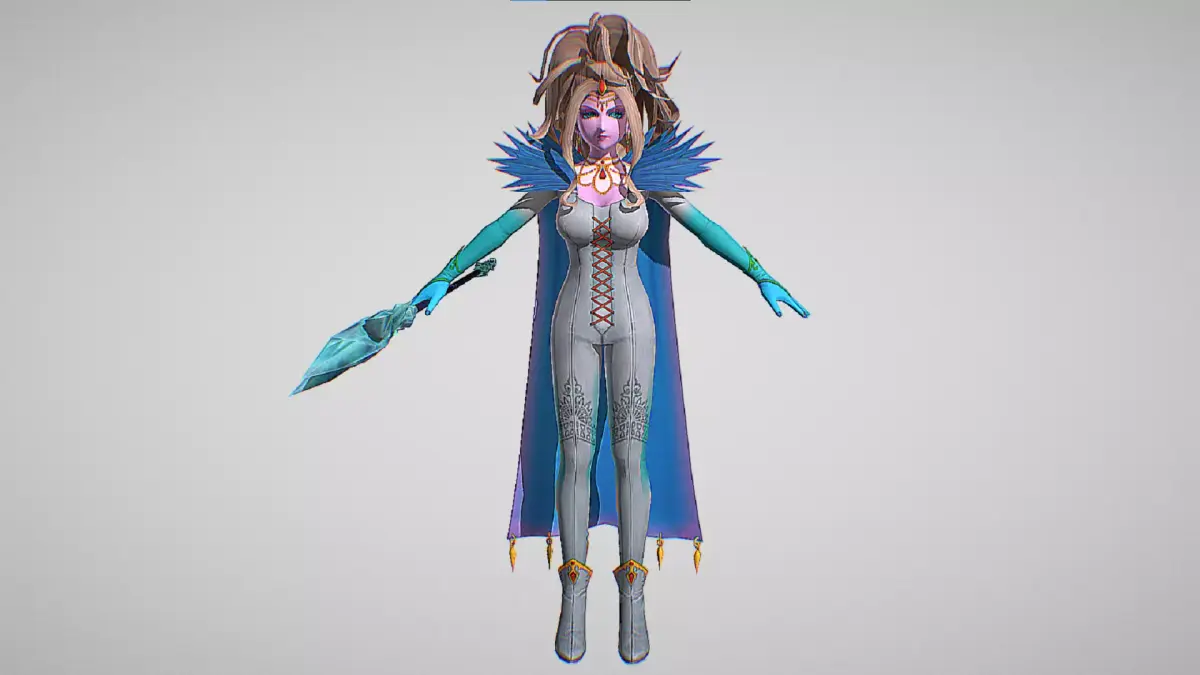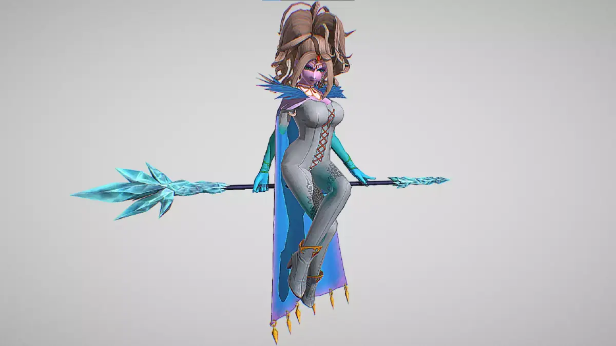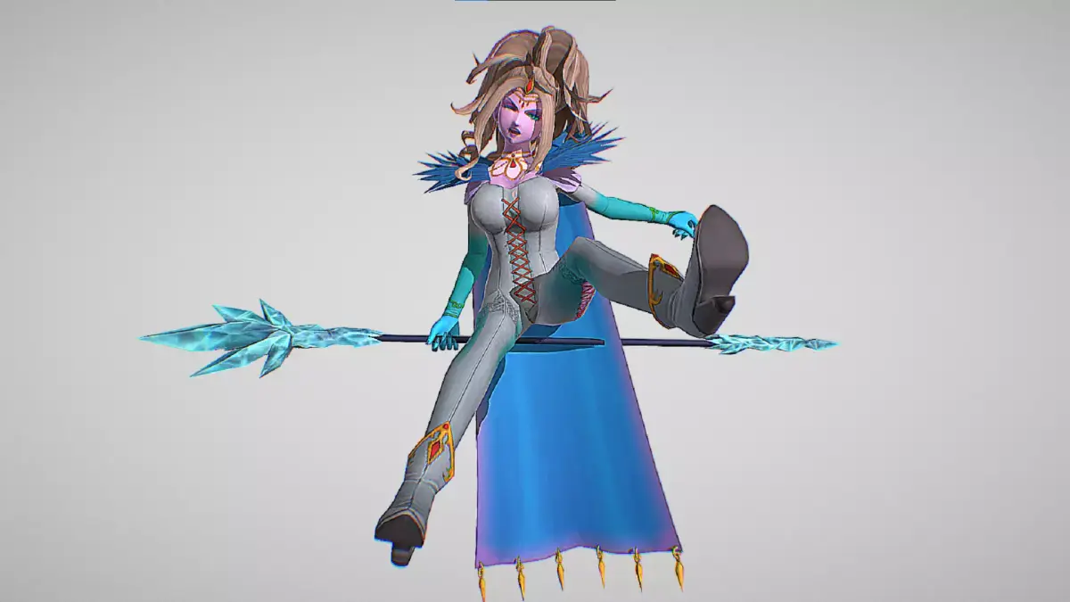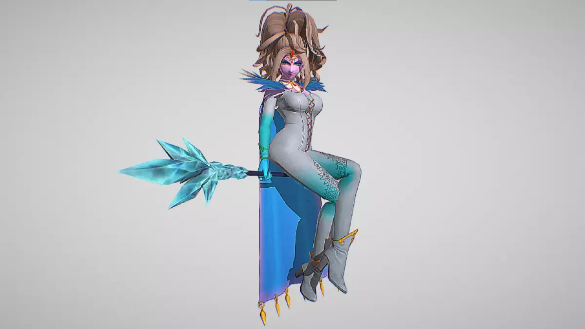 Krystalinda is a beautiful, voluptuous woman with long white-blonde hair worn in a large, unkempt ponytail, light purple frost-bitten skin, and dark purple lipstick and eye-shadow. She wears a gold circlet adorned with rubies, a diamond-shaped gold and ruby hair-clip on her forehead, a triple-looped necklace, a dark purple cape with a ragged collar, a silver jumpsuit (which appears sky blue in game), with orange fasteners and an embroidered pattern on each thigh, and matching armlets and high-heeled ankle boots. She is always seen holding a maroon staff with an icicle-covered tip.