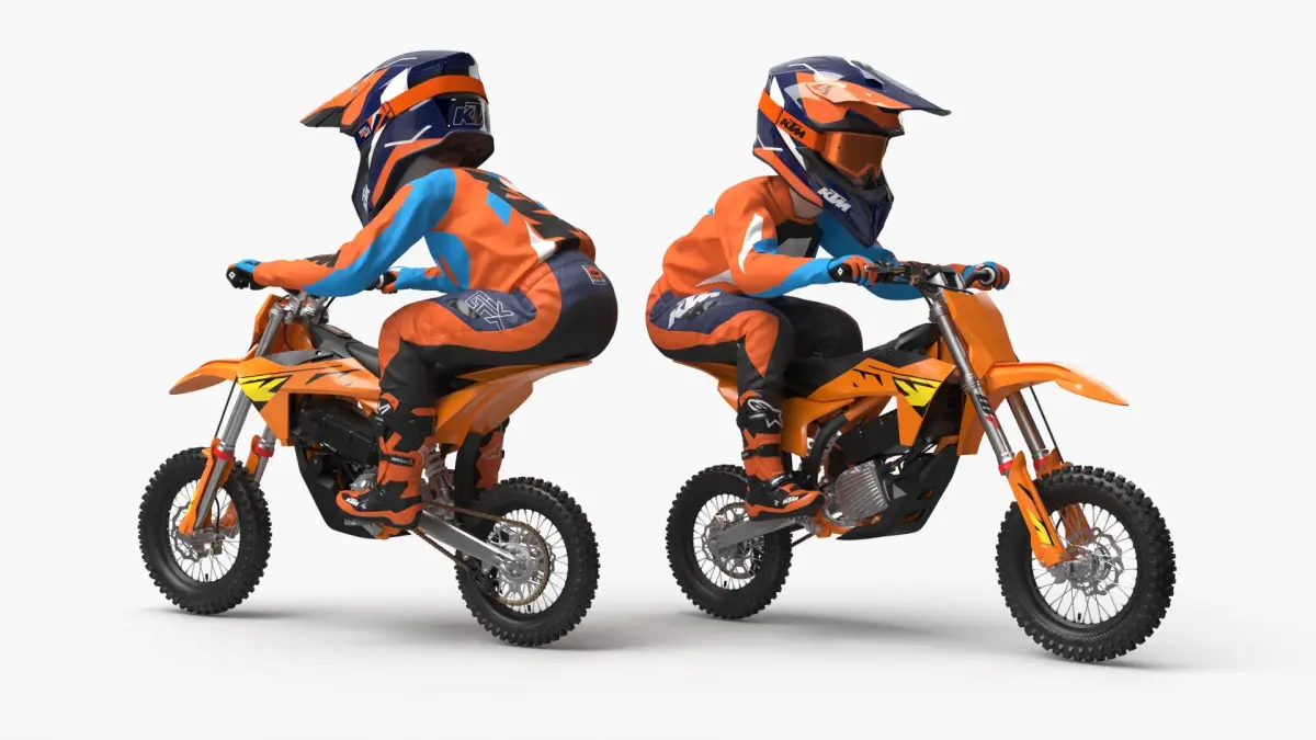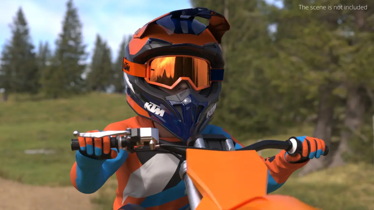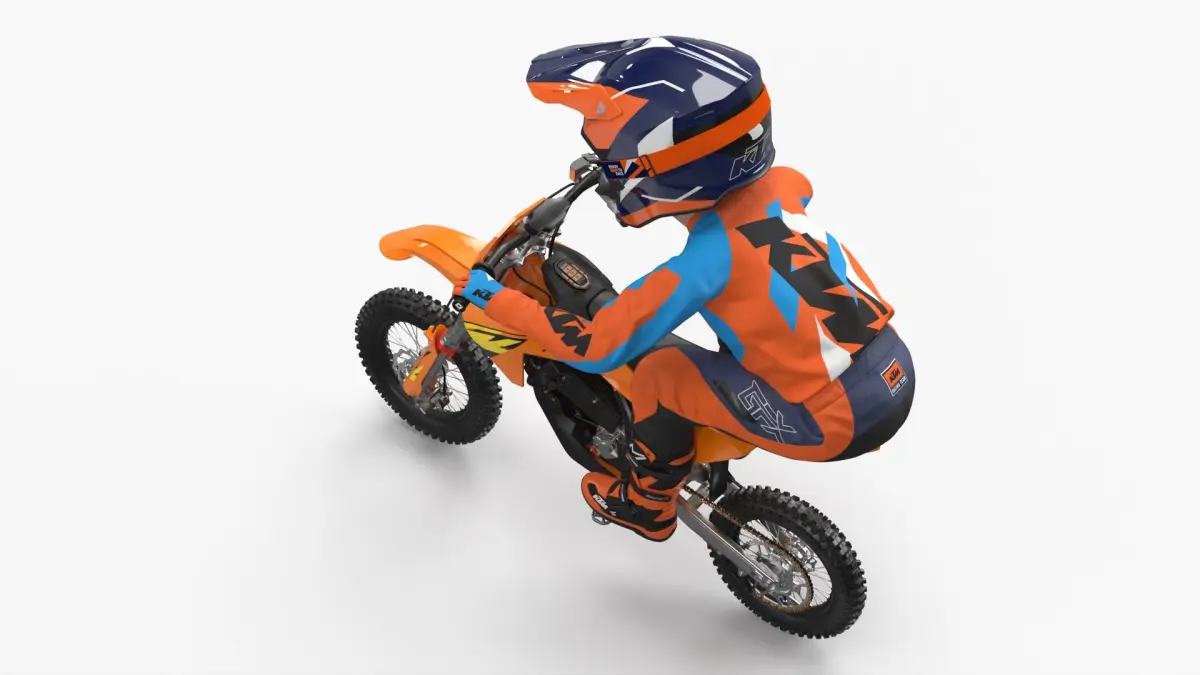 KTM Junior Off Road Motorcycle Rider Crouched is a 3d model of youth off-road motorcycle apparel, specifically designed to provide safety and comfort for young dirt bike enthusiasts.
