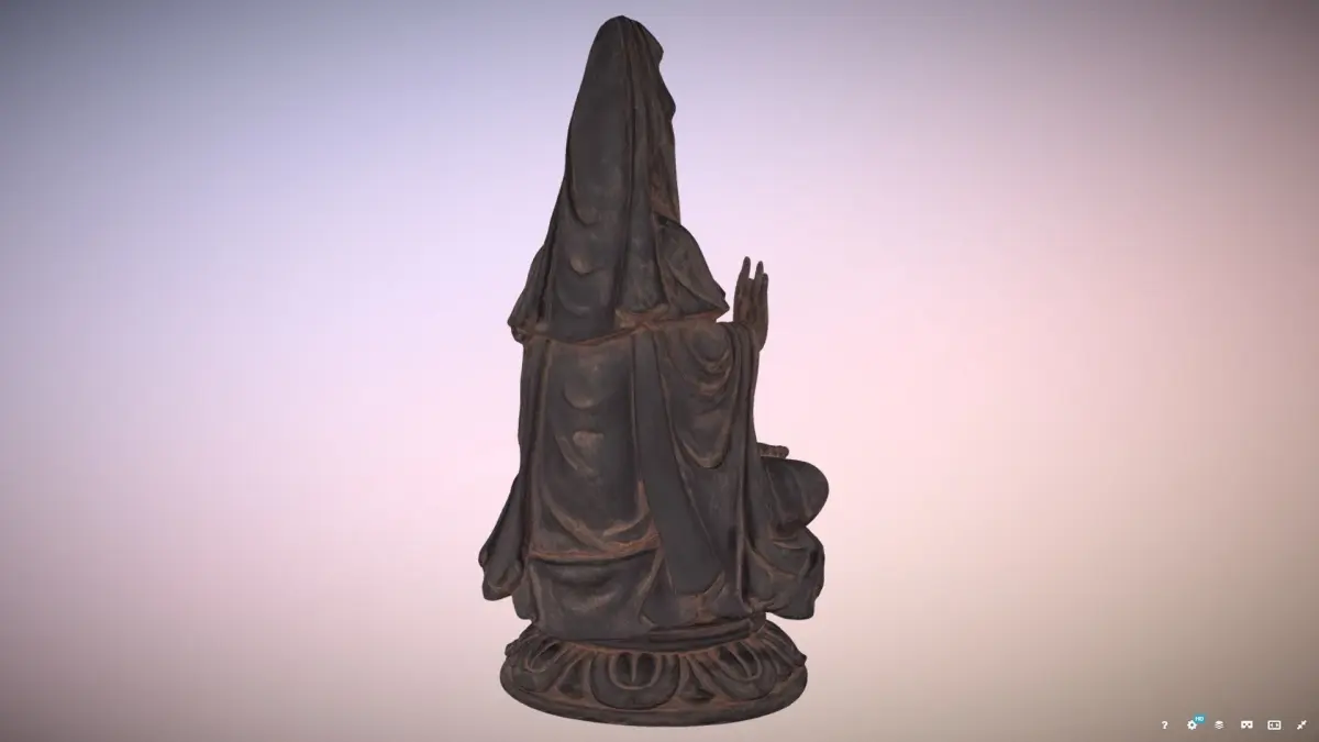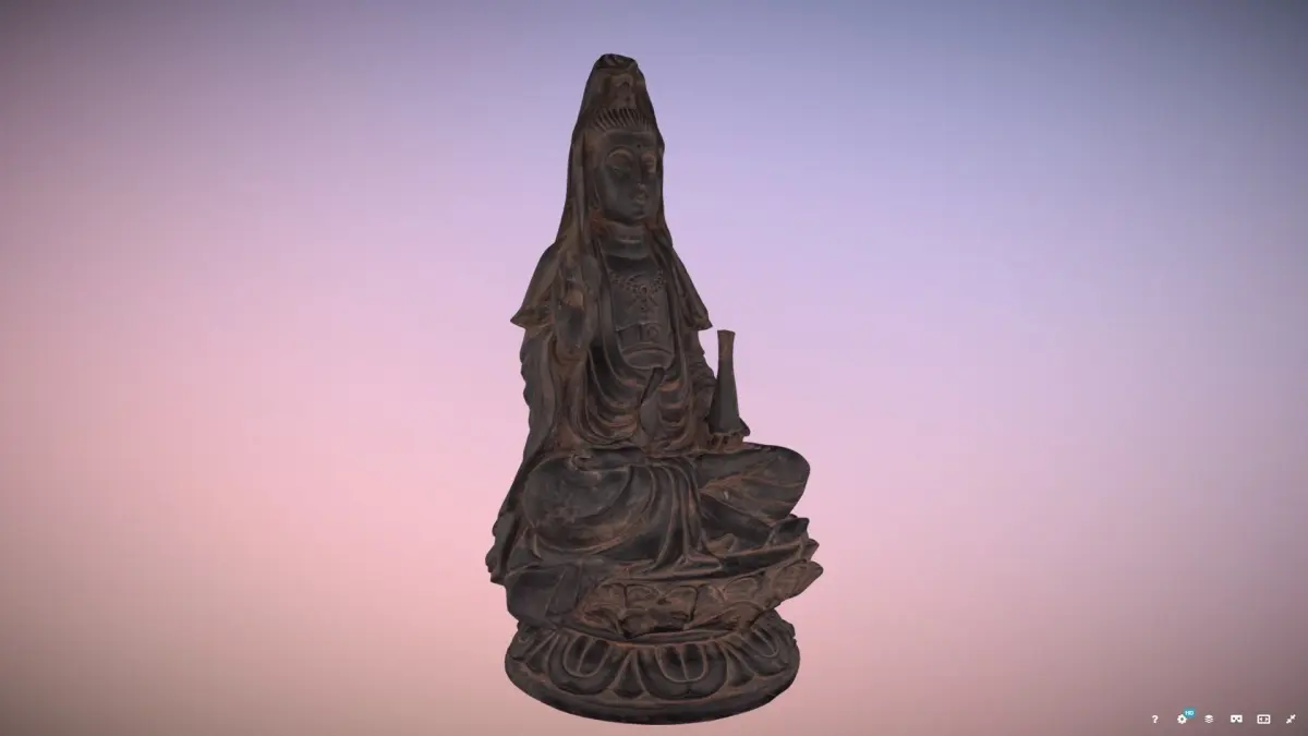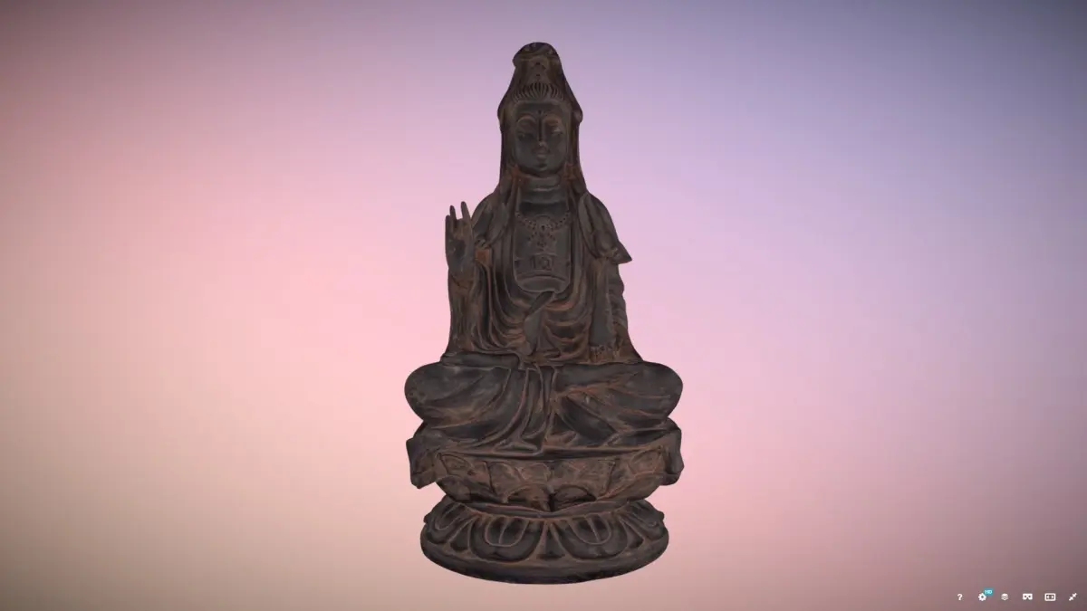 Photo-real, unlit, texturized model of a Wood carved Kuan Yin Buddha. This object was generated using photogrammetry with a DSLR camera and images edited in Light Room, compiled in Reality Capture, and re-topologized in Insta-Mesh. The mesh is edited in Agisoft, and model retextured in Reality Capture.