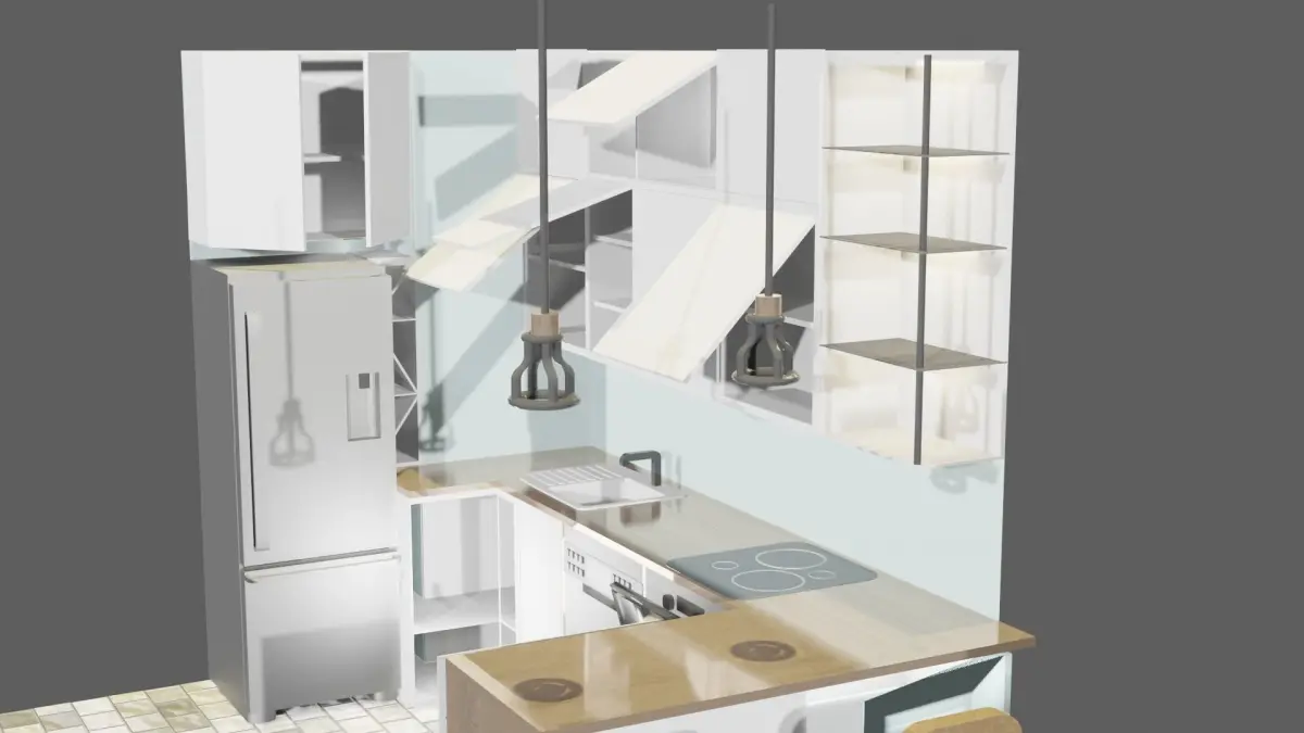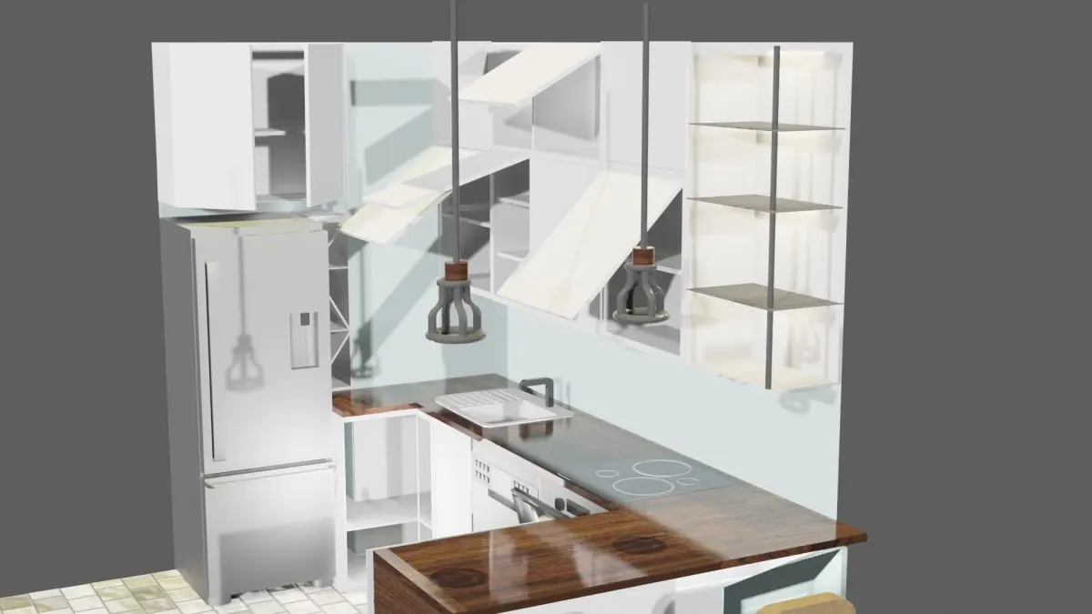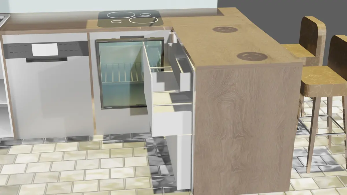 Kuchnia zaprojektowana w programie blender. Cała wyposarzona zawiera:-lodówka,-piekarnik,-płyta indukcyjna,-lodówka,-komplet szafek,-zmywarka,-blat,-chokery.