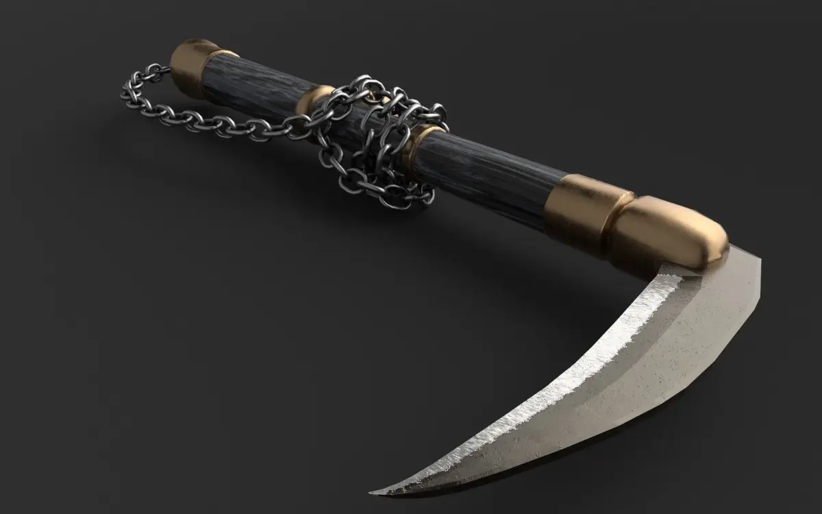 A kusarigama is a traditional Japanese weapon that consists of a kama (the Japanese equivalent of a sickle or billhook) on a kusari-fundo – a type of metal chain (kusari) with a heavy iron weight (fundo) at the end. The kusarigama is said to have been developed during the Muromachi period. The art of handling the kusarigama is called kusarigamajutsu.