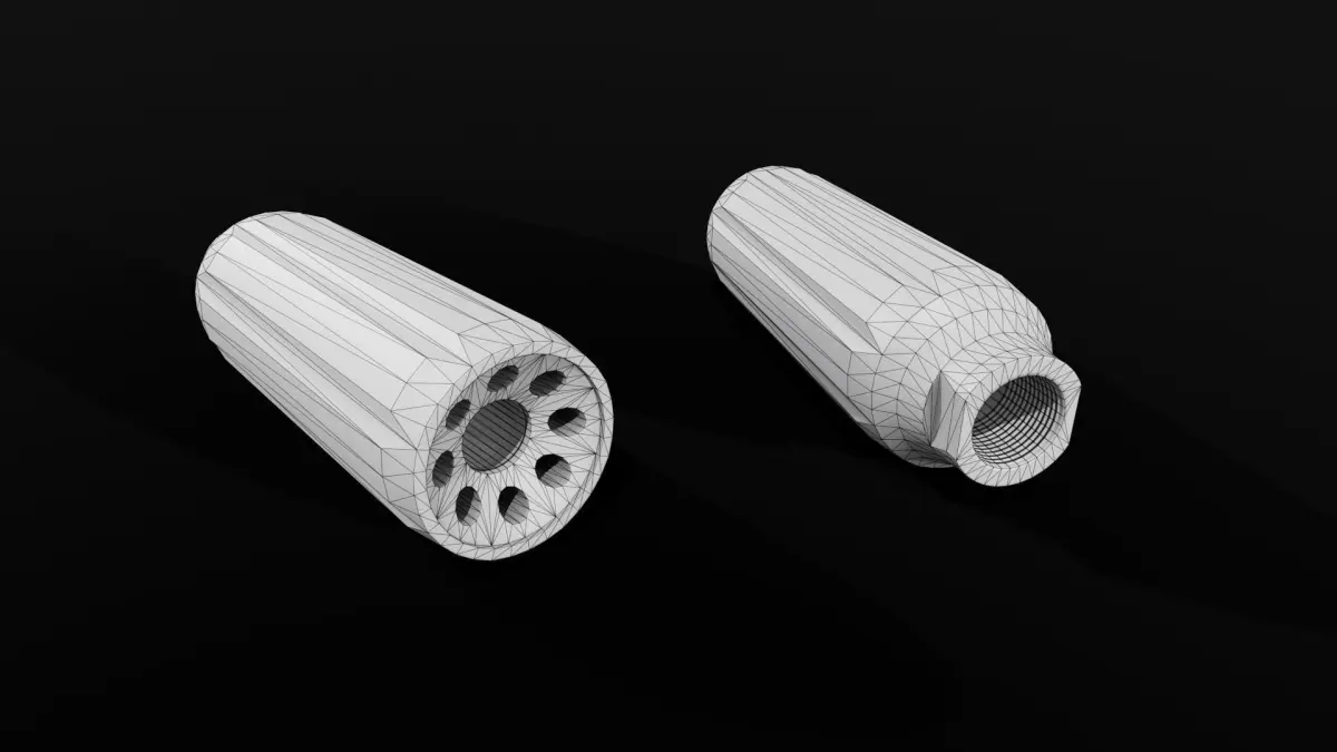 Game ready model of a Kaw Valley Precision XL 45ACP Pistol Caliber Linear Compensator.