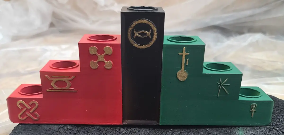This was originally designed and created as a gift for my neighbors during the 2020 Holiday season. I would like to make this available to a larger audience.Kwanza Celebration Candle holder can be printed at 100% scale via FDM 3d printing or 101% for SLA Resin printing (calculated based upon typical shrink during resin curing)It is designed to fit standard candle sticks or LED candlesticks. Enjoy!