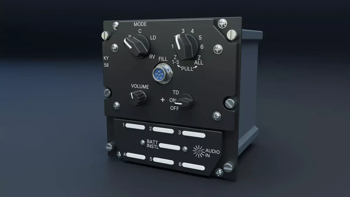 The VINSON KY-58 is a secure voice encryption unit designed to protect radio communications between military aircraft and other tactical vehicles. It is used by the U.S. Joint Services, NATO forces, and certain law enforcement agencies. It used in A-10, A/MH-6, UH-60, F-16, F/A-18, etc.