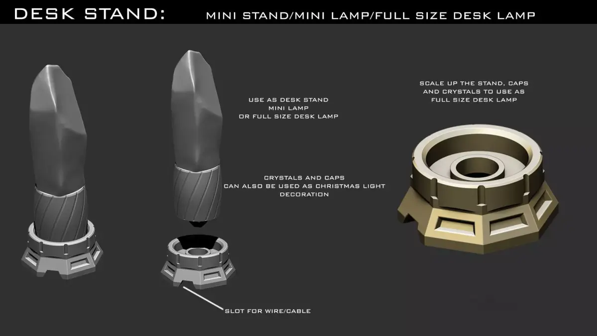 - there is a desk stand that you can use to display your crystals as they light up, or if you scale it up you can turn it into a fully functional desk/night/decorative lamp