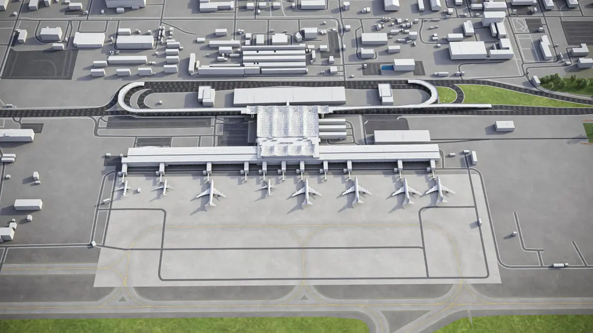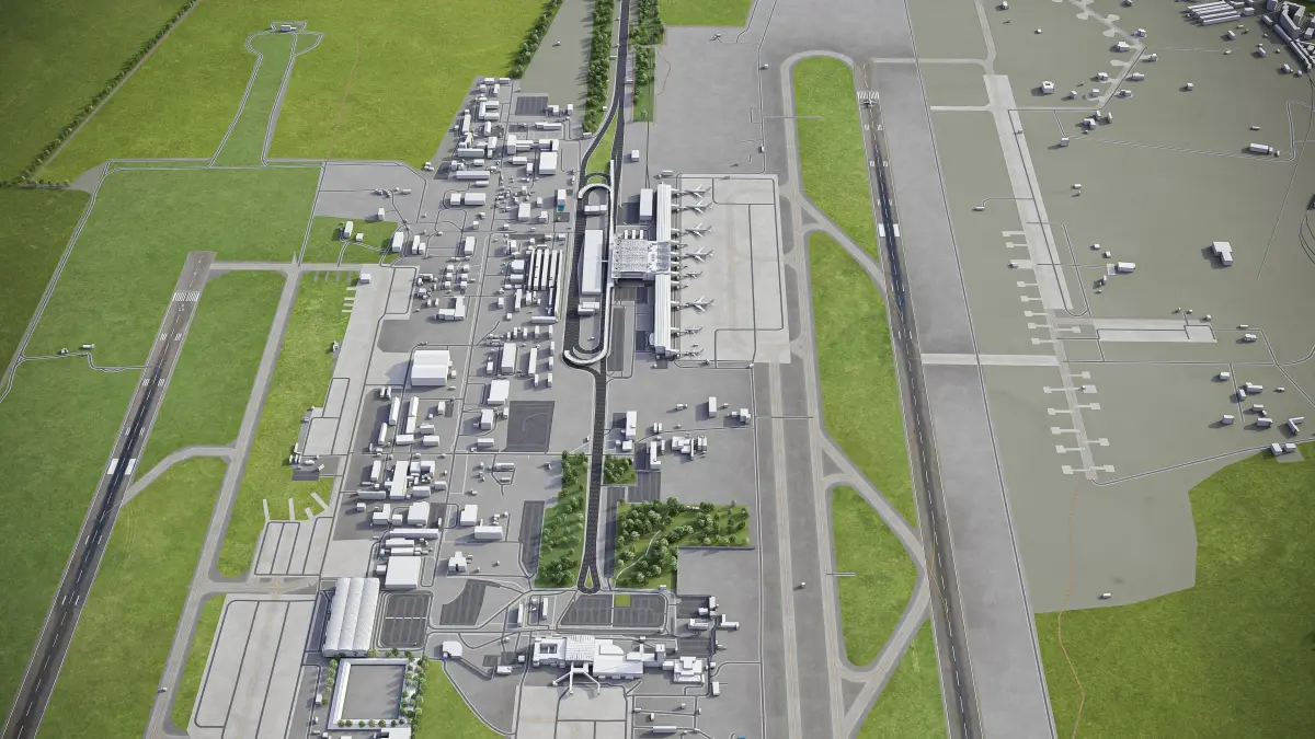 This is exact and accurate to-scale 3D model of Kyiv Boryspil Airport (KBP) and its surrounding area based on GIS data (April 2021)