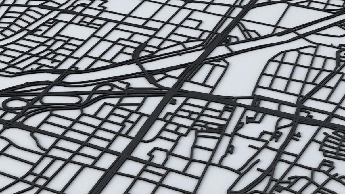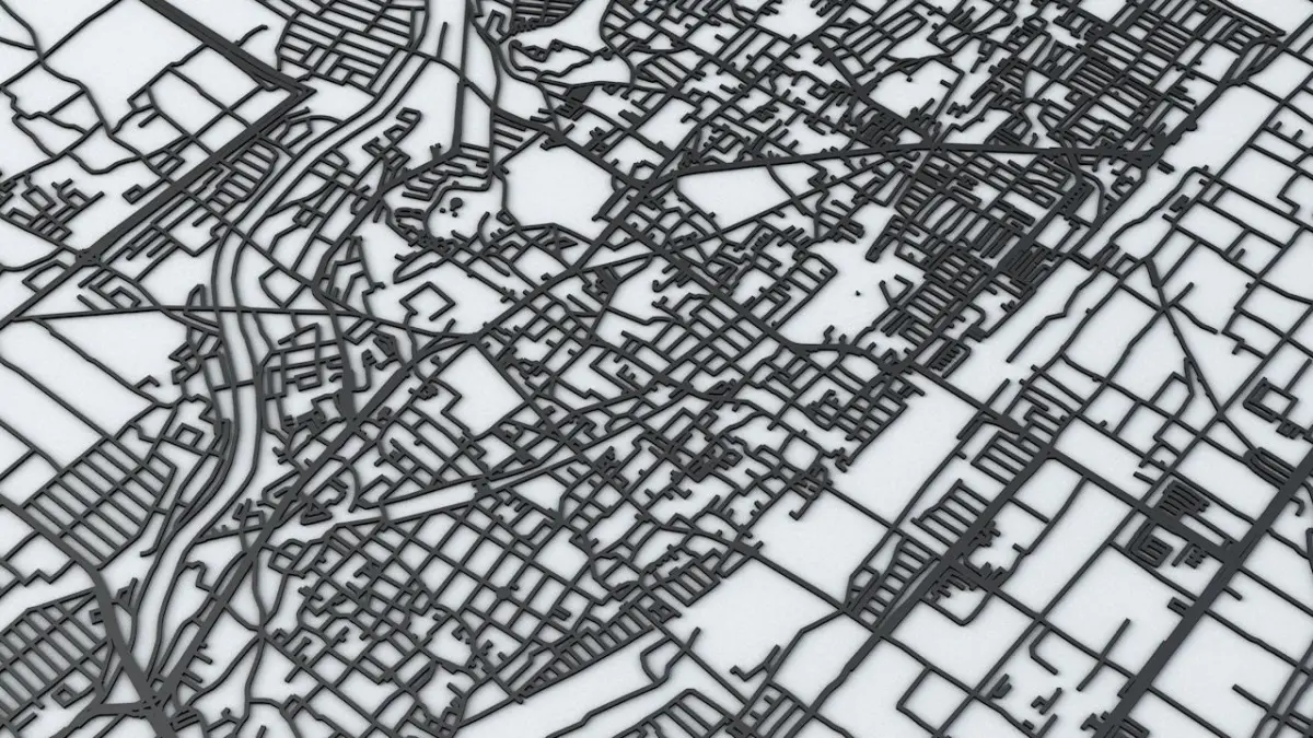 - the model is positioned on a flat surface (road network is on the “floor” - no elevation data included)