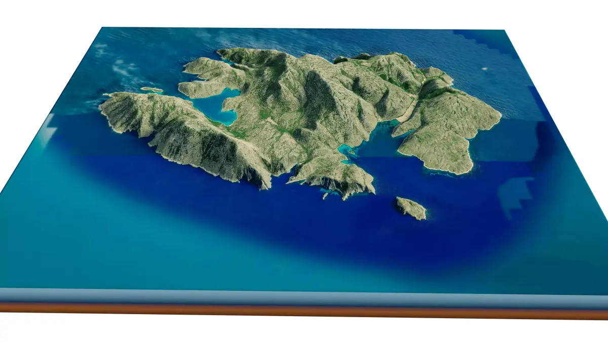 Kyra Panagia Island 3D model terrain. 3d model island of Kyra Panagia, Greece with its landscape of mountains, beaches and forests.