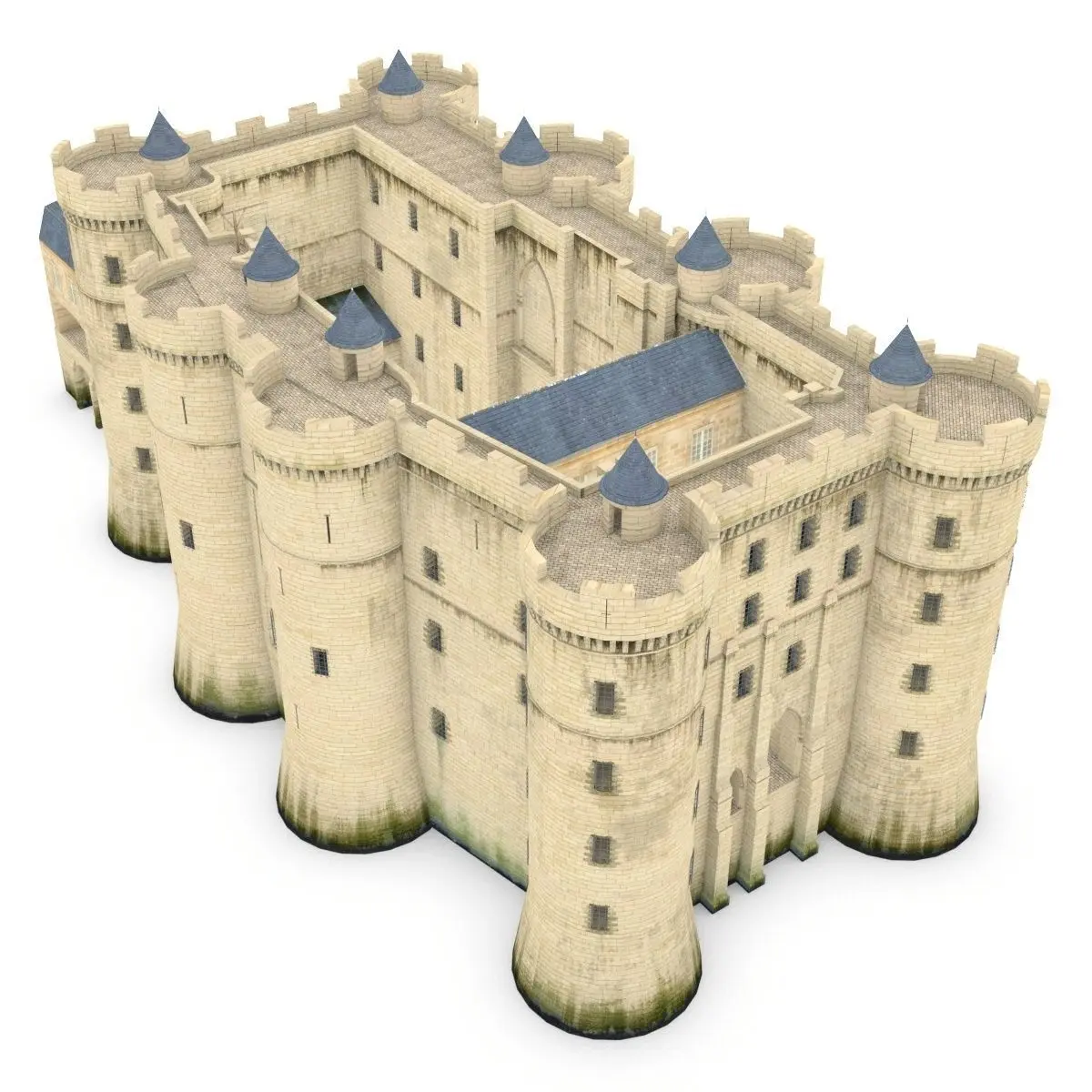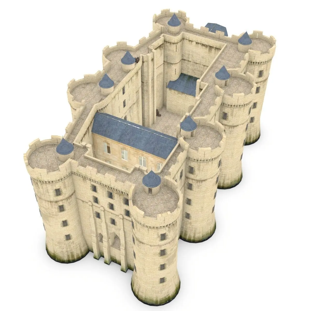 Prison cells are modeled inside towers, including shackles and graffitis.